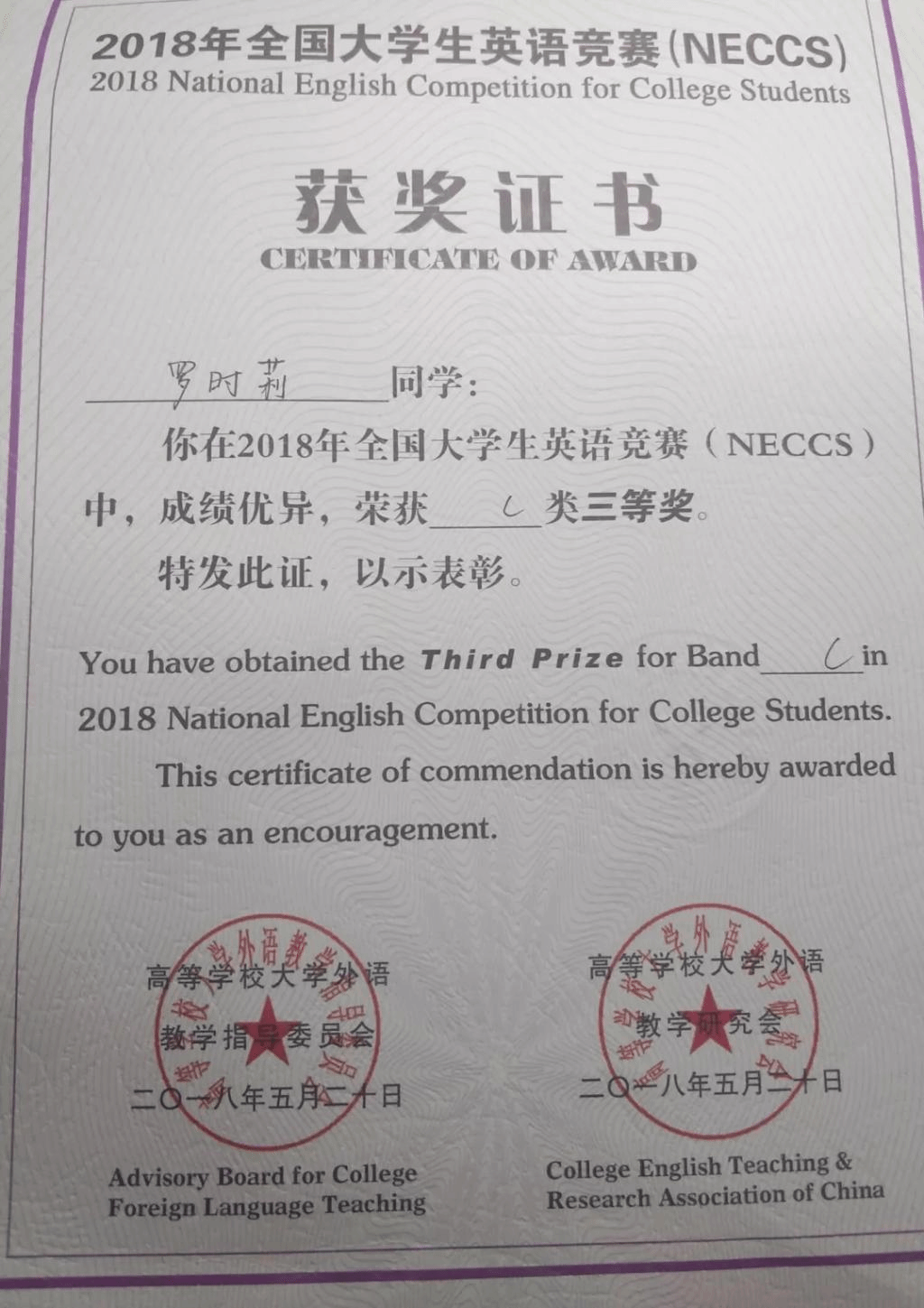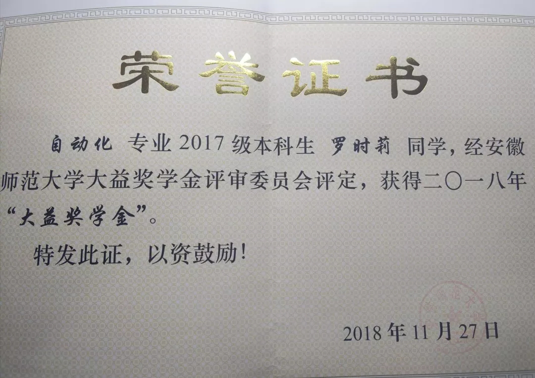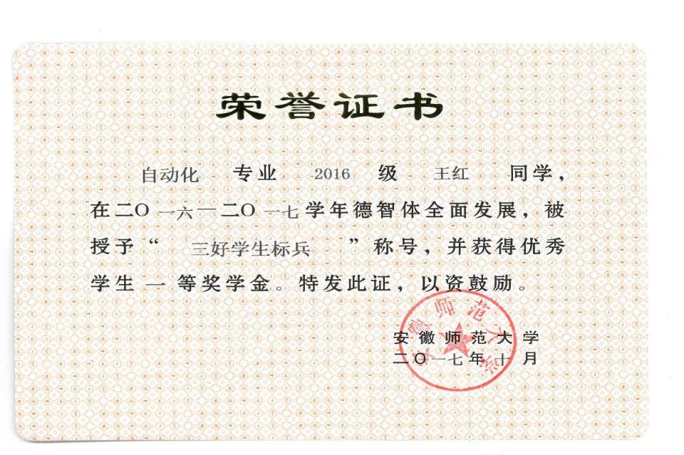 获奖情况:校级:①2016-2019连续三年获得校一等奖学金和“三好学生标兵”的荣誉称号;②第九届安徽省双百大赛校级一等奖;第十届安徽省双百大赛校级三等奖;③ 朱敬文奖学金;省级:第五届“互联网+”大赛省级银奖。国家级:① 2016-2017学年,国家励志奖学金; ② 2017-2018学年,国家奖学金;③2018-2019学年,国家励志奖学金。