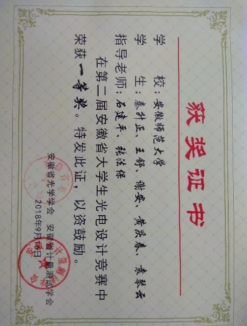 光电信息科学与工程专业全力支持学生自主创新创业。组织学生参加全国大学生光电设计大赛、全国大学生电子设计大赛、全国大学生智能汽车竞赛、全国大学生数学竞赛、国家级/省级/校级大学生创新创业训练计划、芜湖市大学生专利设计大赛10余项国家级、省级等各类学科竞赛。近五年来,光电专业学生在国家级、省级高水平学科竞赛中获奖百余项,获奖人数逐年增多,获奖层次不断突破。其中全国大学生智能汽车竞赛获国家级、省级奖项30余项;连续三年获全国大学生数学竞赛国家级一等奖;光电设计大赛获省一等奖五项;其余省市级奖项若干。