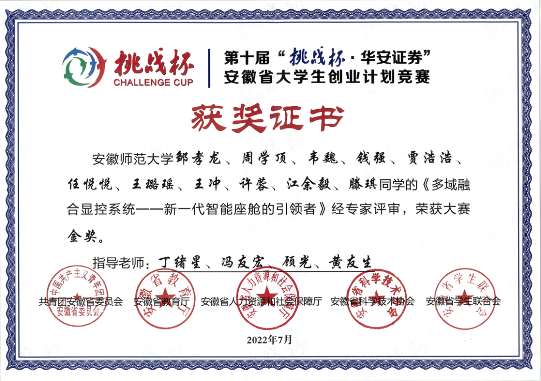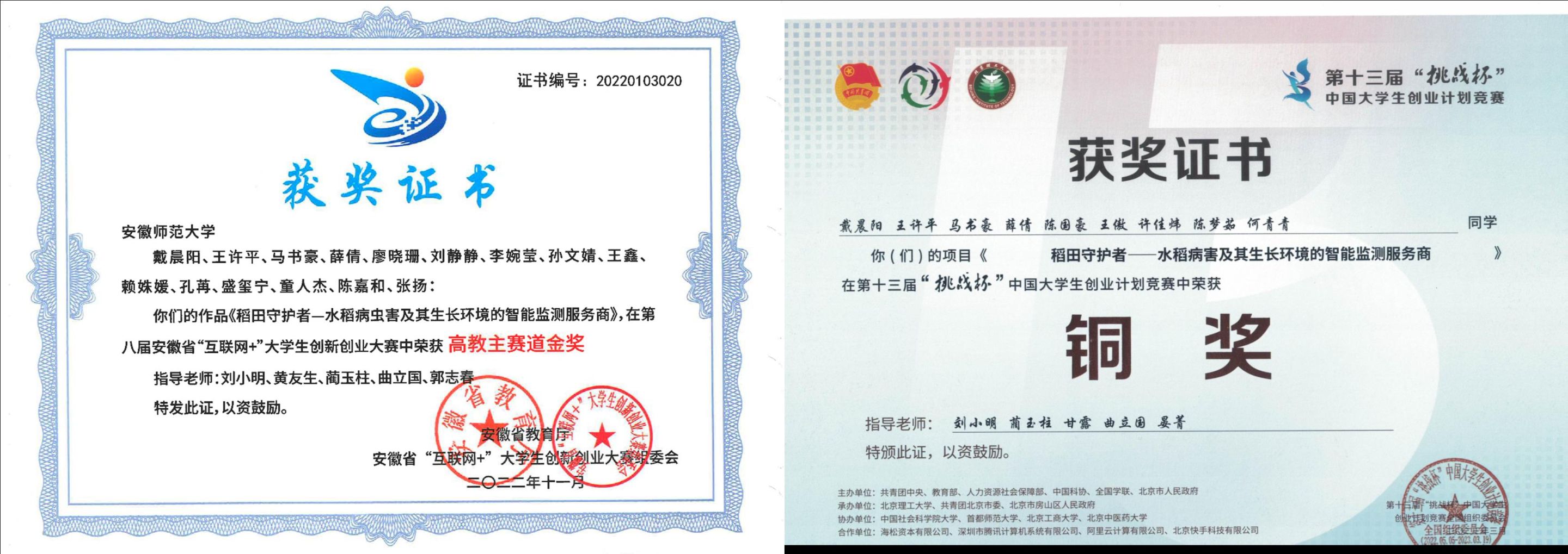 “互联网+”大学生创新创业大赛 高教主赛道安徽省金奖、挑战杯国家级铜奖