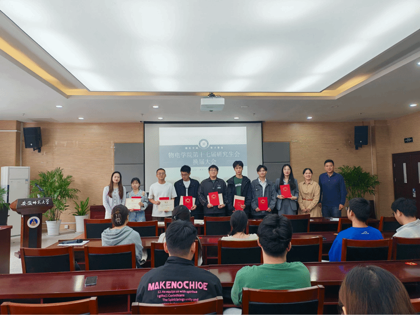 在物电楼304会议室召开2024年度研究生会述职与换届大会。大会旨在总结过去一年研究生会的工作成果并谋划未来一年的工作方向与目标。本次会议的出席人员有院团委书记张津源老师,24级研究生新生辅导员王亚青老师,校研究生会主席沈乙丹,第十六届研究生会代表以及第十七届全体研究生会成员。