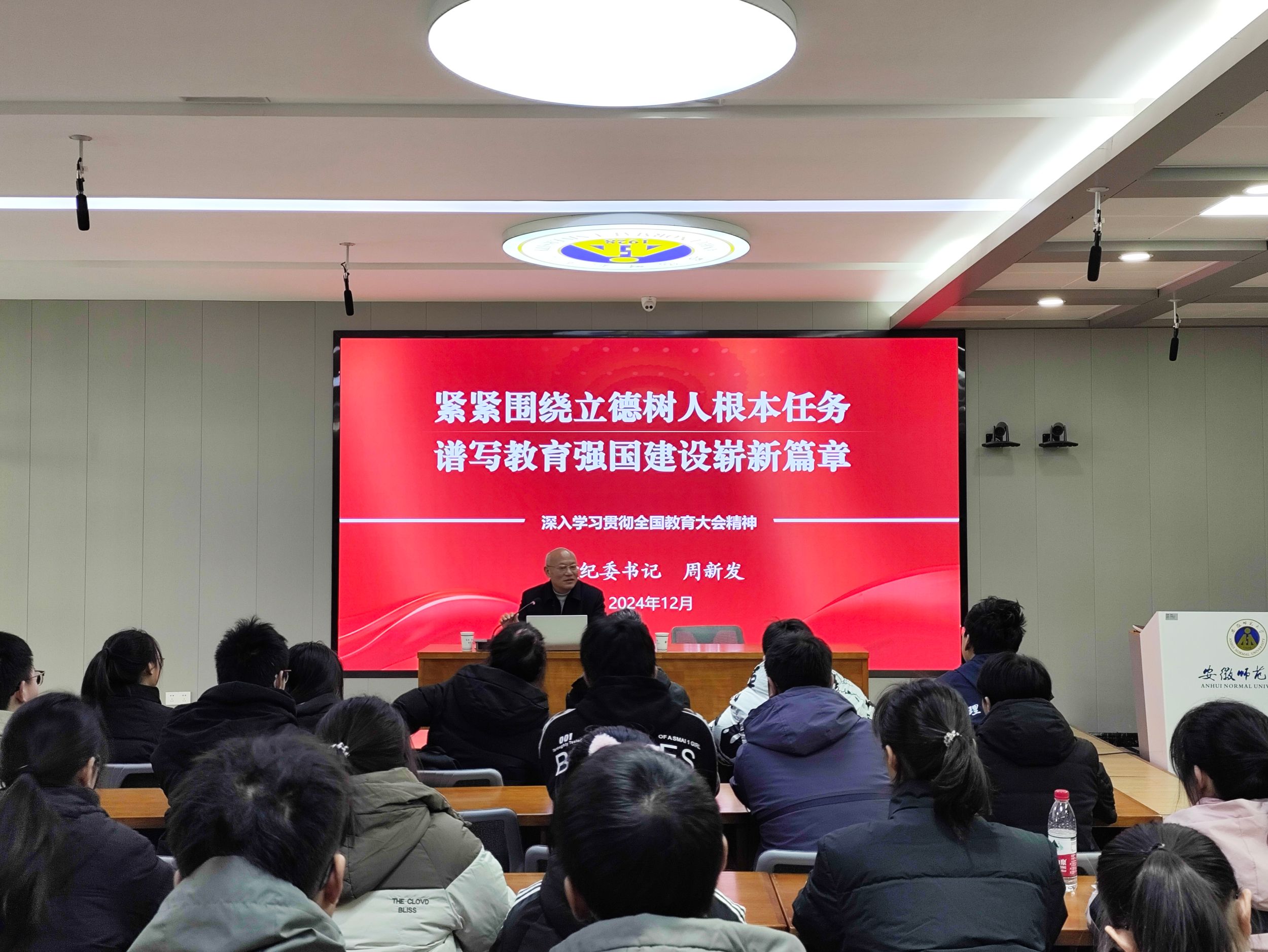 周新发以《紧紧围绕立德树人根本任务 谱写教育强国建设崭新篇章》为主题,围绕着“深入学习习近平总书记重要讲话精神、深刻认识全国教育大会的重大意义、全面系统学习宣传全国教育大会精神、全力推动全国教育大会精神落地见效”这四个方面展开授课。他指出,学习贯彻全国教育大会精神,是当前和今后一个时期教育系统的重要政治任务。我们要深入学习贯彻习近平总书记重要讲话精神,把思想和行动统一到习近平总书记重要讲话精神和党中央决策部署上来,务实功、出实招、求实效,奋力谱写教育强国建设崭新篇章。他强调,建设教育强国是一项长期而艰巨的任务,需要我们坚持不懈、久久为功。作为高校大学生,要深入学习领会、全面贯彻落实全国教育大会精神,增强责任感和使命感,积极进取、奋发有为,为加快建设教育强国、全面建设社会主义现代化国家贡献力量。