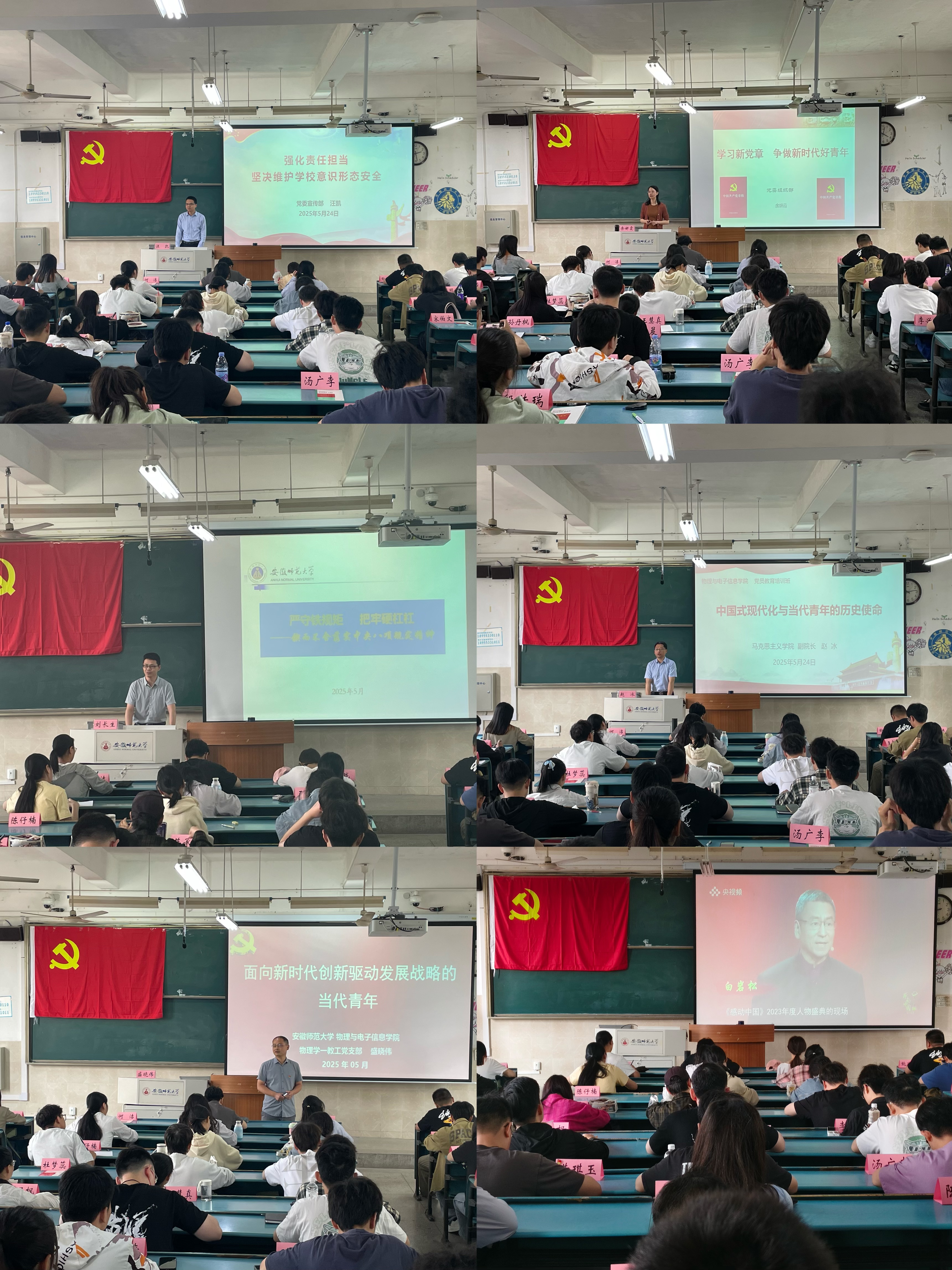 副院长盛晓伟等领导老师分别围绕《强化责任担当,坚决维护学校意识形态安全》《学习新党章,争做优秀党员》《严守铁规矩,把牢硬杠杠——锲而不舍落实中央八项规定精神》《中国式现代化与当代青年的历史使命》《面向新时代创新驱动发展战略的当代青年》为学员授课。视频教学环节,学员们共同观看了《感动中国》《榜样9》等学习教育纪录片。专题研讨环节,学员们围绕深入贯彻中央八项规定精神学习教育等开展热烈的专题研讨。实践活动环节,开展理响物电微宣讲、朋辈交流会和校园内自行车摆放等,引导学生在参加实践、服务同学中强化宗旨意识。