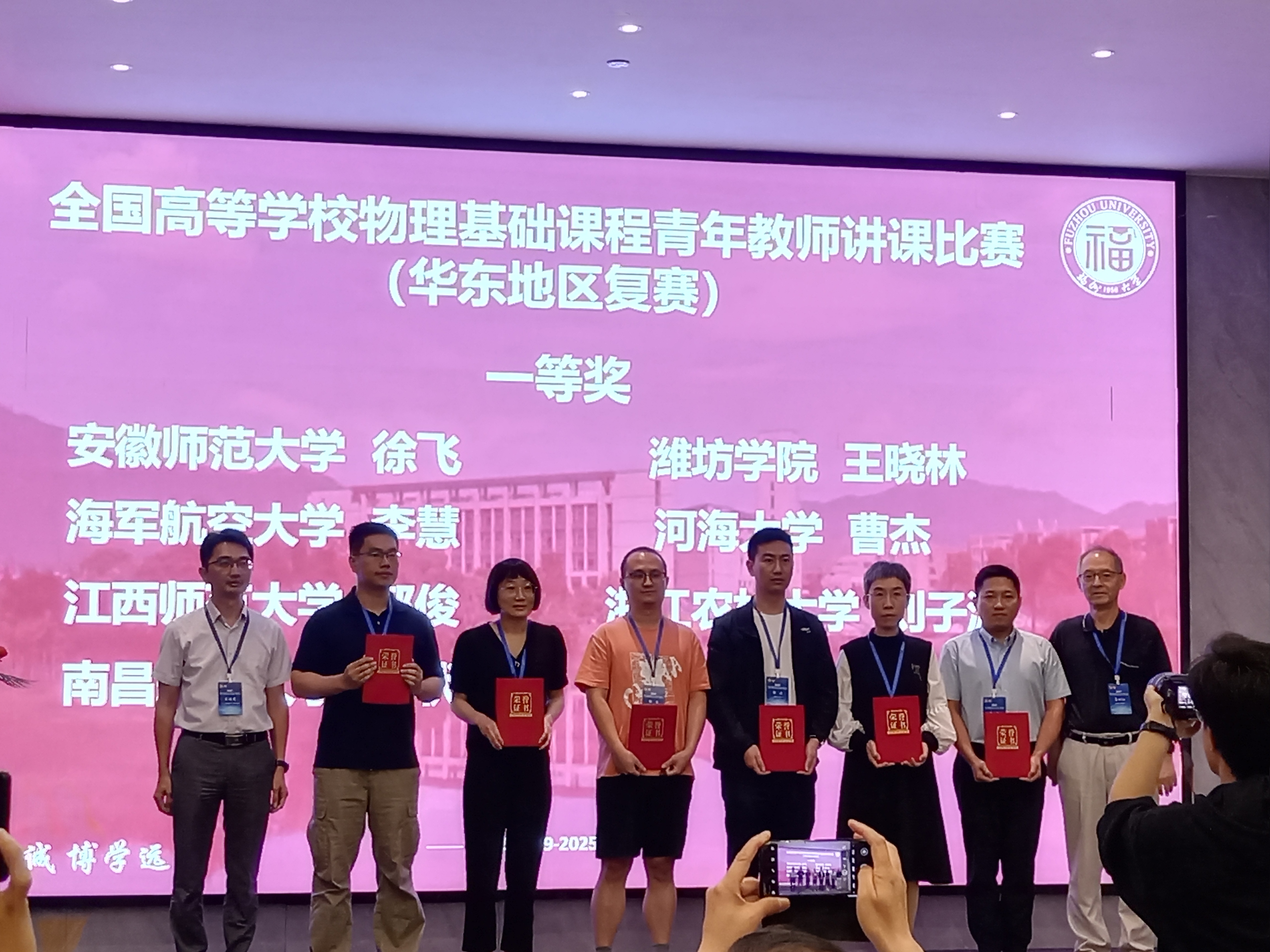 本次比赛由教育部大学物理课程教学指导委员会华东地区工作委员会主办、福州大学承办。华东地区包括厦门大学、同济大学、河海大学在内的15所高校的15名选手同台竞技。比赛内容涵盖力学、热学、电磁学、光学及近代物理等《理工科类大学物理课程教学基本要求》的所有A类知识点。参赛教师现场随机抽取赛题,需在一小时内完成备课,通过28分钟完成教学设计展示、课堂讲授及互动答辩环节,全面考察教学内容的科学性、教学方法的创新性以及课程思政的融入能力。徐飞老师通过“物理学史导入+理论推演深化+前沿应用延伸”的三维教学法,将抽象的物理概念转化为生动可感的认知体验,获得了现场评委的一致好评,取得一等奖第一名的好成绩。