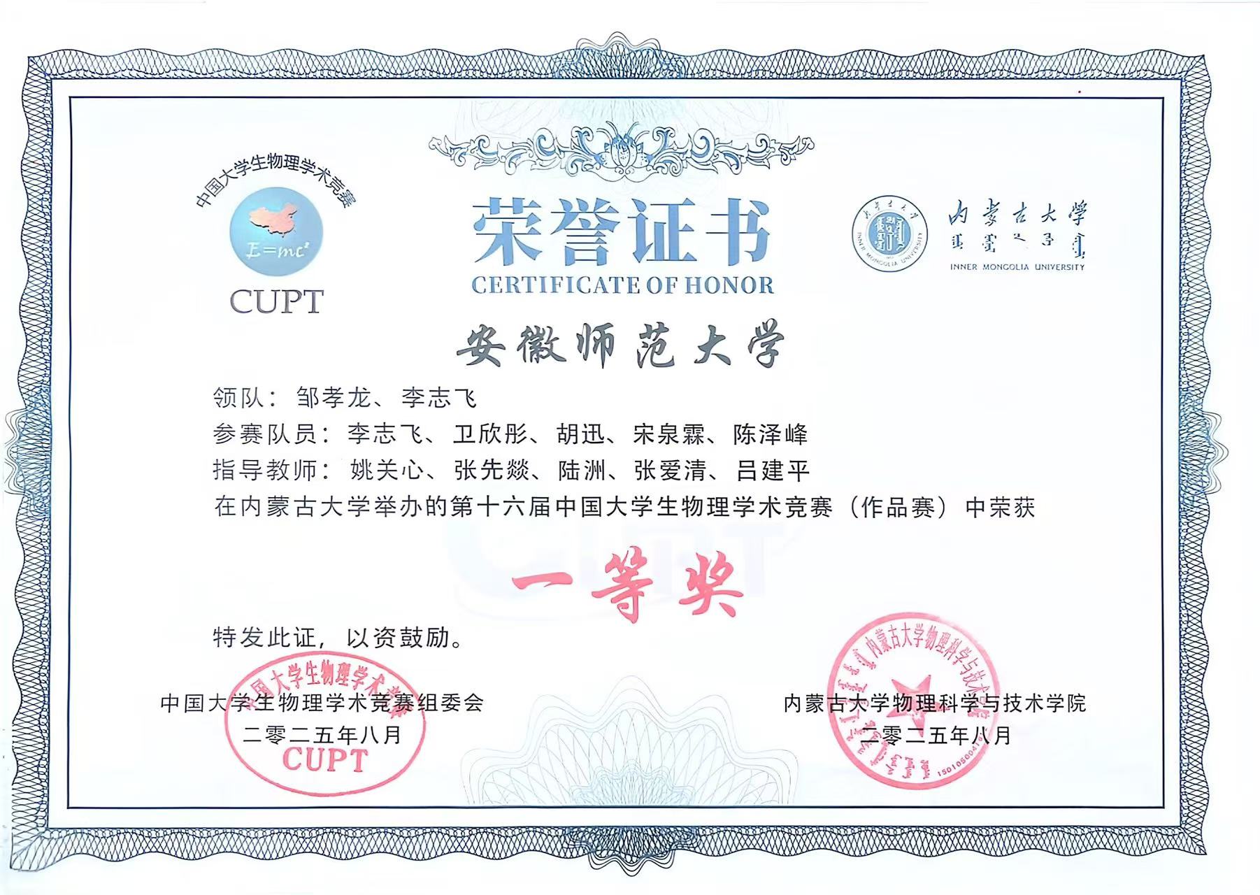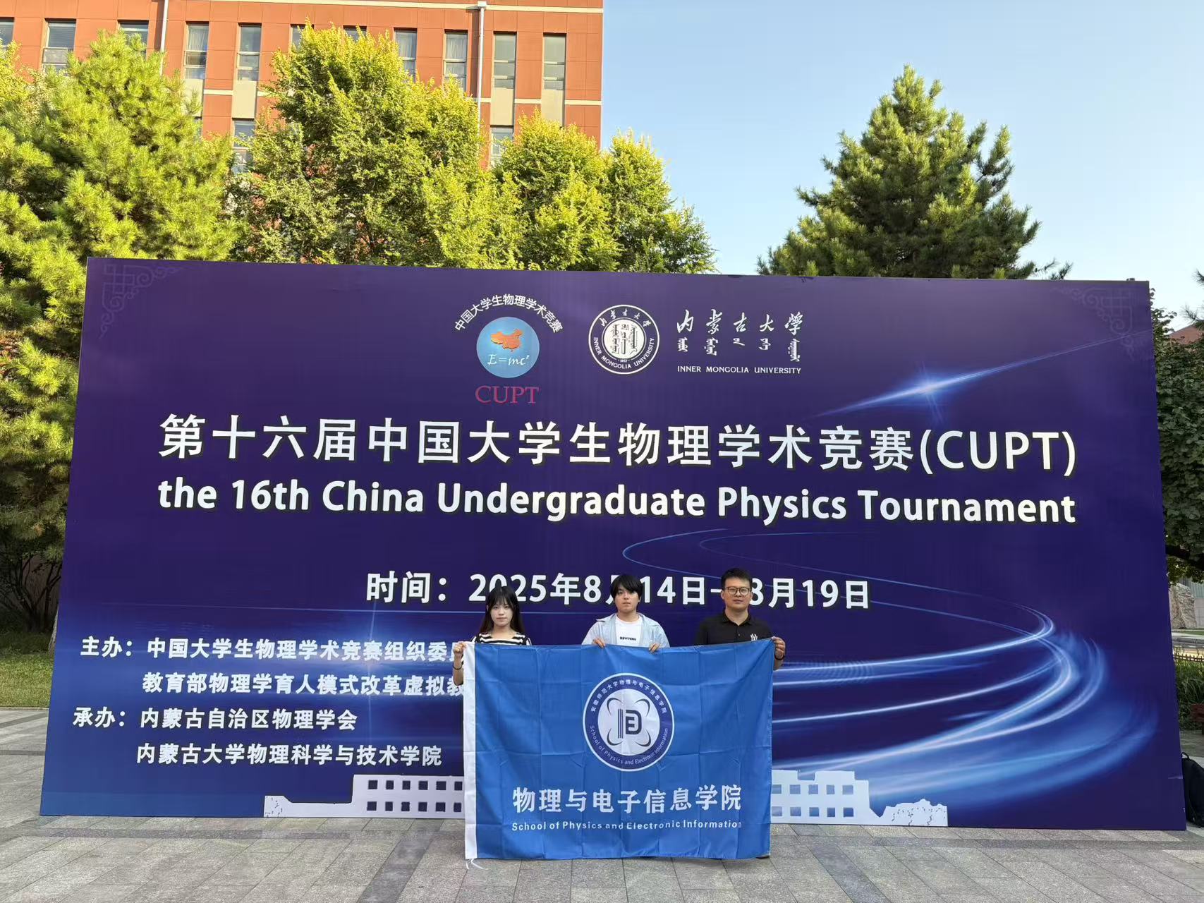 近日,第十六届中国大学生物理学术竞赛(China Undergraduate Physics Tournament,简称CUPT)在内蒙古大学圆满落幕。我校代表队在作品赛中表现优异,荣获全国一等奖(最高奖),创下我校在该项赛事中取得的最好成绩。