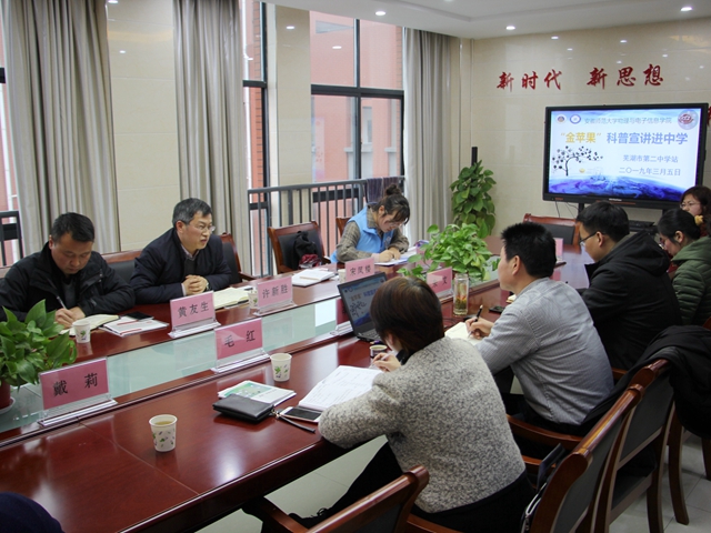 “金苹果”科普进中学行动走进了芜湖市第二中学。芜湖二中党委书记、校长李兵和其他全体班子成员、创客教育负责老师洪蕾,学院党委副书记黄友生、副院长许新胜、团委书记宋凤楼、辅导员刘冠琪及学生志愿者全程参加了活动。