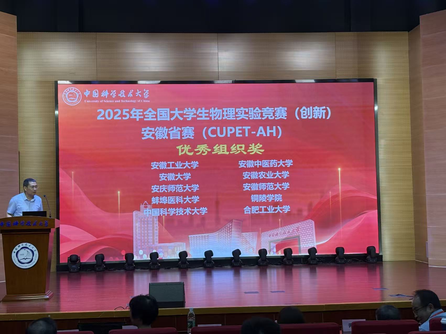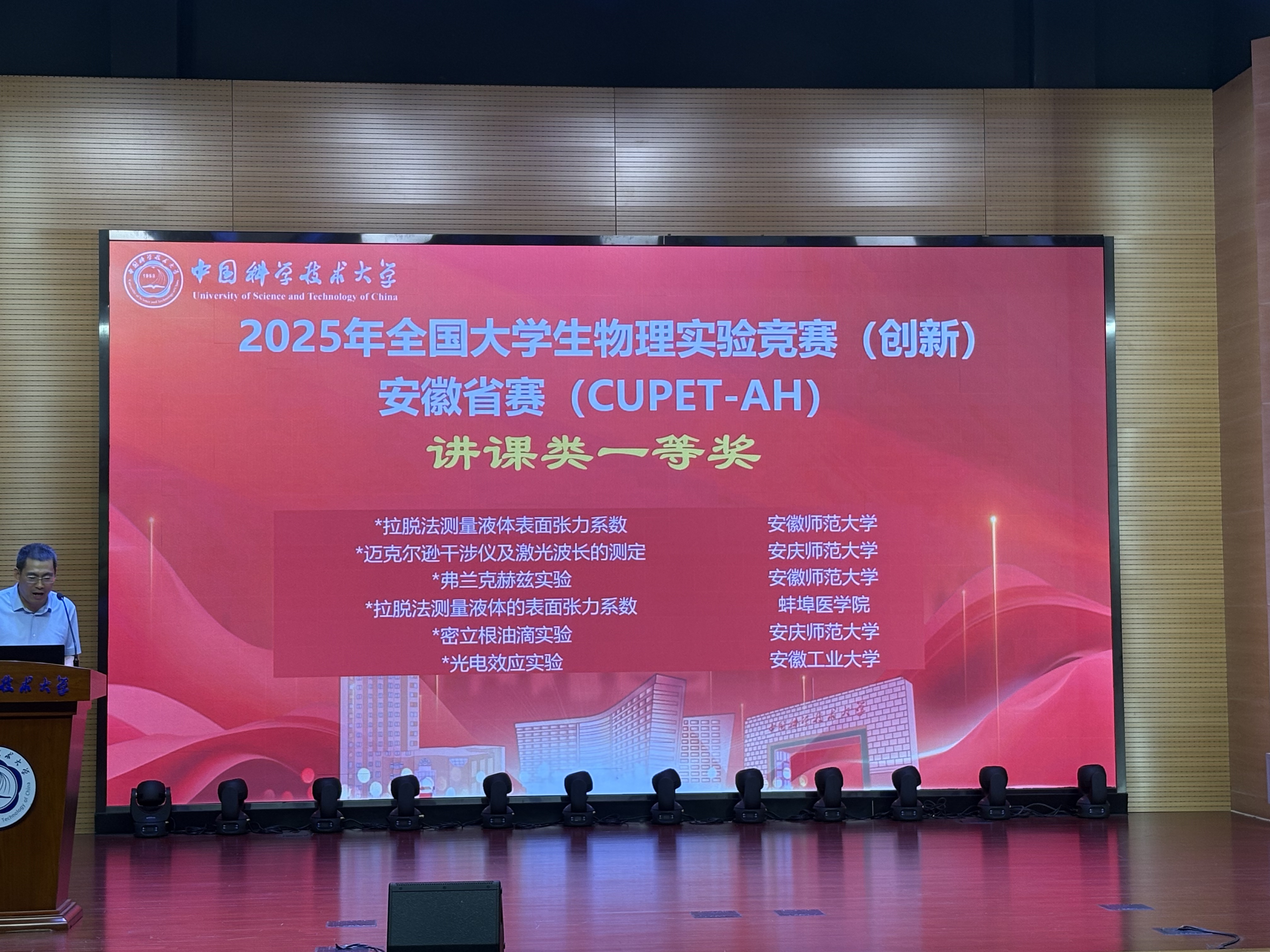 精心组织多轮集训,参赛团队师生全力打磨作品。经过校赛初审、省赛初赛线上评审等环节的重重考验,最终,讲课类《拉脱法测量液体表面张力系数》、《弗兰克赫兹实验》两个项目分别以第一名和第三名的成绩获得安徽省一等奖,并获得国赛直通车的资格。此外,讲课类《用衍射光栅测光波波长》、《玻璃折射率的测定》获得安徽省二等奖,讲课类《全息照相》、《双棱镜测波长》和命题类《光影密码:X射线如何“看见”晶体里的原子?》、《密立根油滴实验》、《简谐振动的合成》获得安徽省三等奖。