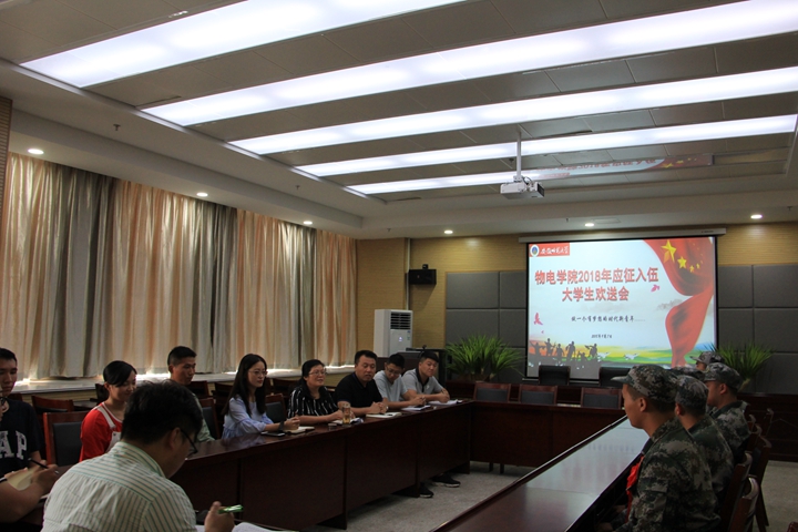 于335会议室举办2018年大学生应征入伍欢送会,院党委书记李娟,院党委副书记黄友生、全体辅导员老师、退伍学生代表及2018年应征入伍大学生参加欢送会。