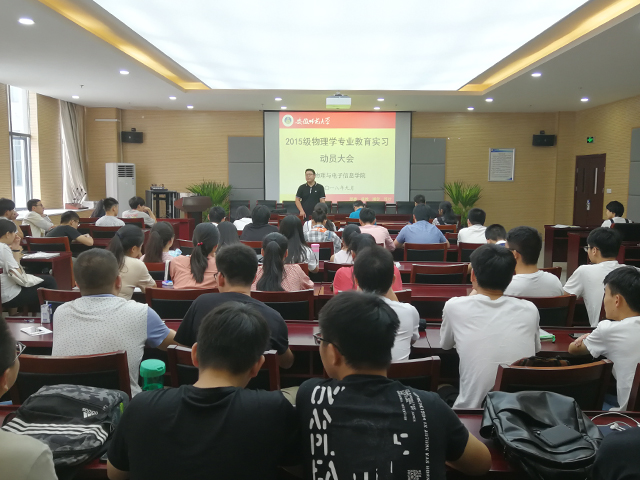 于物理楼304报告厅进行了教育实习动员大会。出席本次大会的有院党委副书记黄友生,教学副院长许新胜以及2015物理学全体学生。会议由辅导员米佳佳主持。