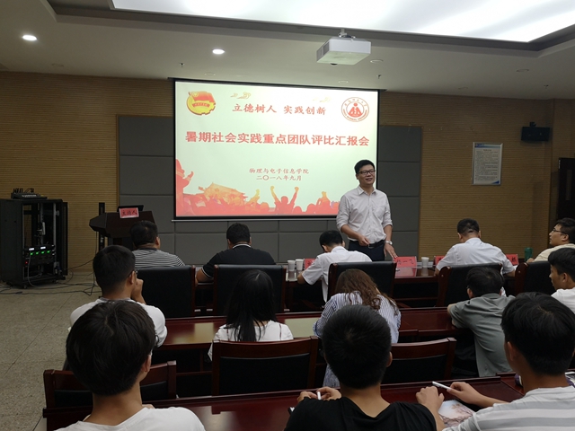 在理化大楼304报告厅举行2018年暑期社会实践重点团队评比汇报会。校学生工作部副部长、学生处副处长杨一飞,校团委副书记刘长生,学院党委副书记黄友生和全体专兼职辅导员担任汇报会评委,学院各实践团队队长以及2018级新生代表参加了汇报会。汇报会由学院团委负责人宋凤楼主持。