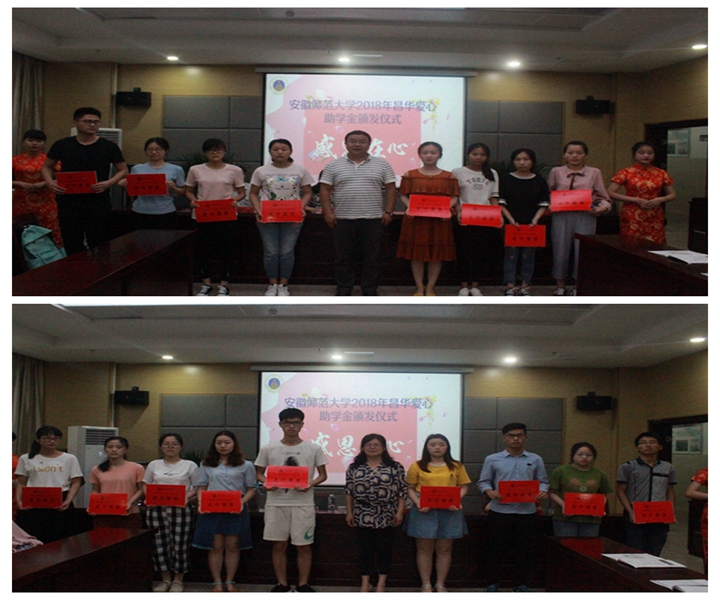 教育基金会昌华爱心助学金的颁发决定》,并希望受助同学心怀感恩,努力学习,力争在未来的学习和生活中取得更大进步。宣读完毕后,史铁杰与李娟分别为两院受助学子颁发助学金并合影留念。