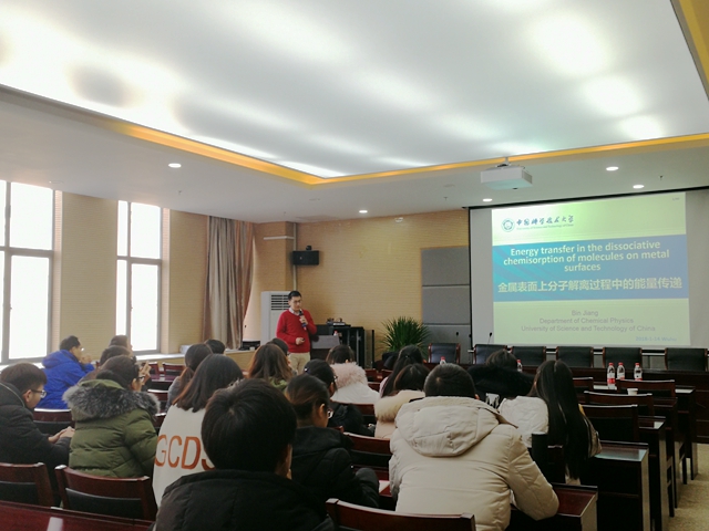 会前,崔执凤院长介绍了蒋彬教授的研究方向和取得的成绩。主要是关注化学反应动力学的理论模拟,包括气相小分子的反应和光解离动力学,气相分子与表面的碰撞散射动力学等;从第一性原理出发,在构建全域势能面的基础上,进行精确的量子或准经典动力学计算,能够细致的模拟这些反应过程中关键的动力学信息,为化学家优化和调控相关反应提供重要的理论基础。随后,蒋彬教授从研究背景、研究方法和研究成果等方面系统的介绍了其研究工作。原理上讲了能量转移方向和电子空穴激发原理以及模式的特异性和振动效应。研究方法主要是动力学方法,包括Global potential energy surface(整体势能面),Static surface adiabatic dynamics(静态表面的绝热动力学)和非绝热动力学等,结合具体的H2O和HCl/Au作了小结。介绍了神经网络计算的应用和ELM和LM相结合的方法在科研上的最新进展。最后,蒋彬教授解答了老师同学们的提问,并就相关问天进行了交流。通过此次报告会,开阔了与会老师和同学们学术视野。