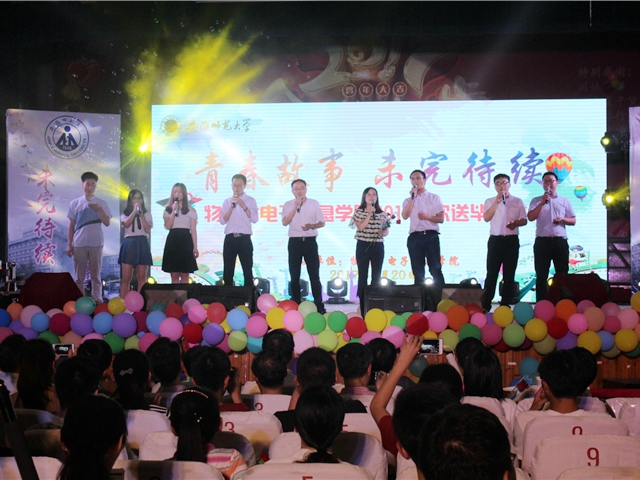 VCR《我们的大学》,拉开了晚会的大幕,也将毕业生们的思绪拉回了2013年9月,懵懂少年,走进师大,开始了他追梦的脚步;四年光阴,弹指瞬间,今天,他即将带着师长的祝福与期盼踏上人生的征途,正如学院党委副书记吴长义所说:“同学们,外面的世界是你们大显身手的舞台,希望所有毕业生能牢记校训、弘扬校风,用科技为人民创造财富,用专业为社会传递知识,用智慧为自己创造多彩的人生。”VCR《我们毕业了》,忘不了曾经的青涩与美好,荷园、食堂、水房、教室、实验室,忘不了师长们的谆谆教诲,忘不了同窗室友的一路陪伴,忘不了在大学四年的点点滴滴。师大,在这里,我们可以安放青春。