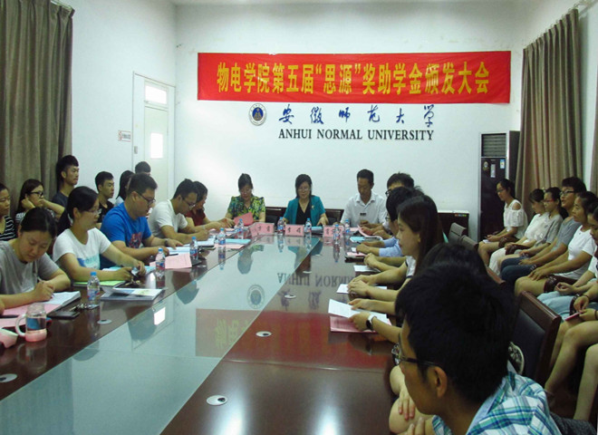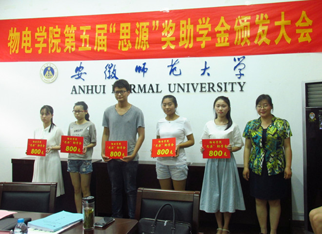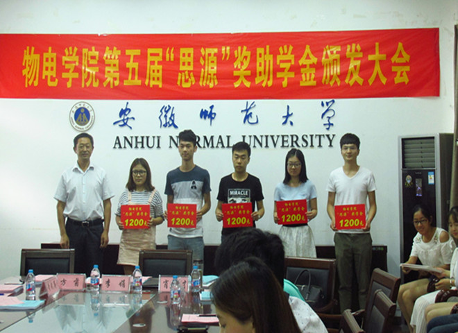 第五届“思源”奖助学金颁发大会在综合楼五楼第二会议室举行。出席颁发大会的有原物理系86级校友方茵、92级校友肖宏才、学院党委书记李娟、副书记吴长义、学院黄武英副教授和全体辅导员。大会由吴长义主持。