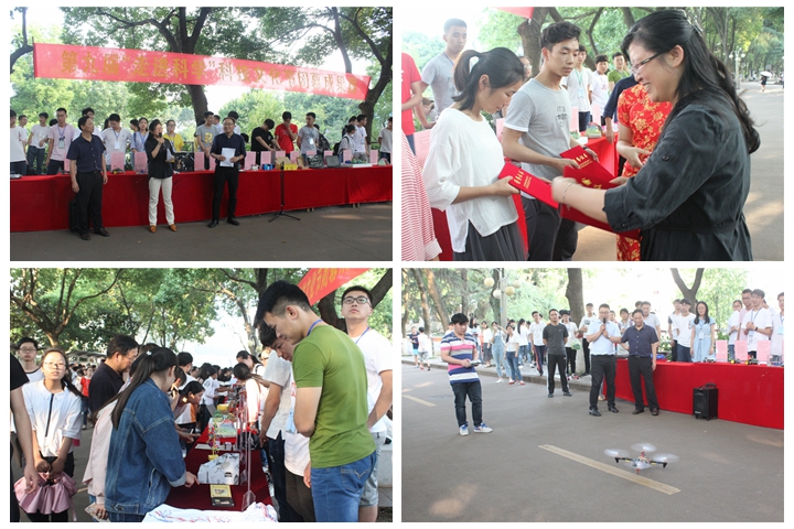 表彰大会结束后,获奖学生进行了科技作品展演。本次学生科技作品展演分为实物演示、展板演示和科普知识竞答三个区域,获奖学生和工作人员通过对作品的展示讲解,让现场同学们了解了作品的工作方式。其中,基于51单片机的“智能鱼缸”,“智能台灯”,“自动拉窗帘机”、“陆地爬行者”贴近生活,构思巧妙,设计精良;而“火山爆发模型”,“初生演替模型”,“3D全息投影仪”这些学生自制的教学器具,也形式多样、简单实用,充分体现了师范类学生的奇思妙想,吸引了许多同学前来围观学习,现场气氛十分高涨。“基于单片机的无线温湿度采集及航拍的四轴飞行器”展翅高飞,获得现场观众热烈的掌声。科普知识竞答区也热闹非凡,同学们积极参加竞答交流。