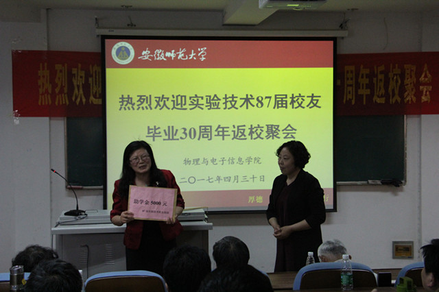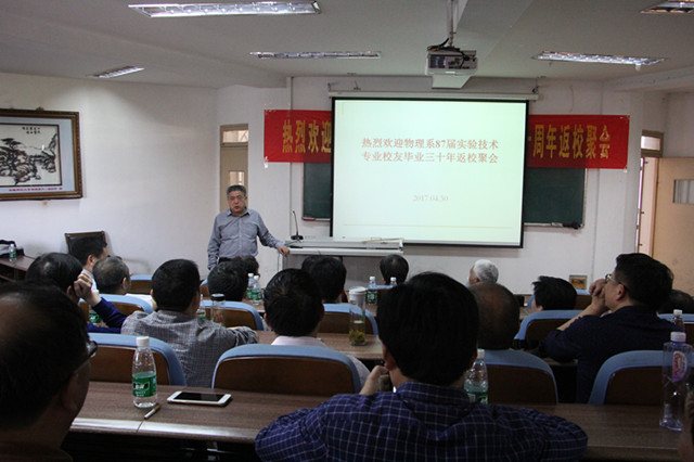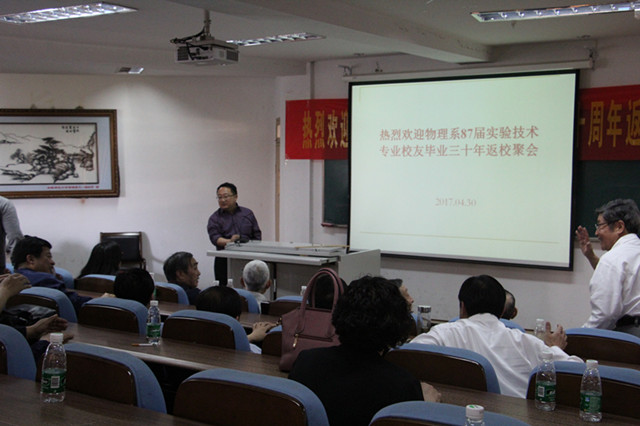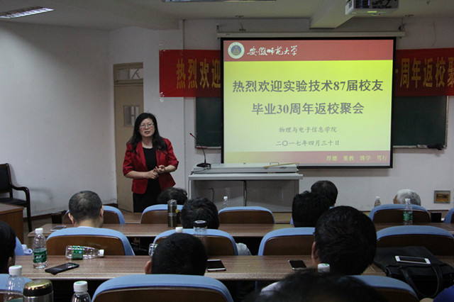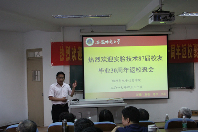 物理系实验技术专业87届校友毕业30周年返校座谈会在综合楼三楼大会议室举行。院党委书记李娟、院长崔执凤,教师代表陶绪德、卢秉嵩、汪国凡、罗资生、叶松庆、杨荣梅及返校的32名同学参加了此次会议,会议由87届校友、我校环境科学与工程学院行政副院长甘为民主持。
