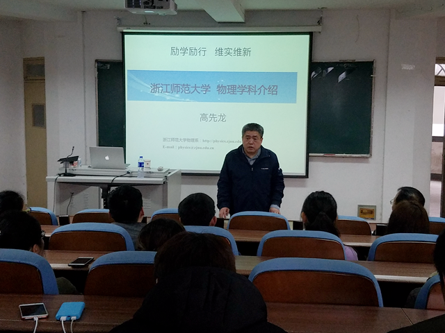 高度重视学生考研工作,他首先表示对高先龙一行表示欢迎,赞扬了浙江师范大学研究生院创新灵活的研究方向、宽阔广泛的研究领域、新颖独特的研究视野。宣讲会上,高先龙主任详细介绍了浙江师范大学研究生院的学科优势、师资力量、研究方向、学术水平以及就业情况。接着,高先龙主任又对浙江师范大学研究生院的招生政策、奖助体系、校园环境等方面进行了介绍。最后,崔执凤鼓励2018年考研学生在考研路上要明确目标、刻苦学习、凝心聚力、坚持到底。