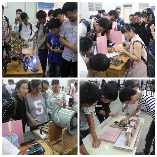 本次学生科技作品展演共分为展板展示区、机器人大赛作品演示区、“创客”大赛作品演示区、全国大学生智能车竞赛作品演示区和电子设计大赛作品演示区等五个展区。展板展示区详细讲述了各类专业比赛概况、历年竞赛成绩统计以及优秀学生代表。作品演示区安排专业教师以及获奖学生进行现场讲解。参观过程中,在2016年安徽省大学生电子设计杯荣获一等奖的作品——风力悬浮控制装置,给在场的每一位同学留下深刻的印象。“哇,学长学姐们真厉害”参观过程中类似于这样的声音在新生队列里不时发出。在2016年全国大学生智能车大赛中获得国家级奖项的小车驰骋赛道上,利用电磁感应“自主探路智能车”、双车轮“直立行走智车”等作品逐一登场,吸引了大量的目光,当看到小车按指令沿赛道正确寻迹时,大家不由得发出赞叹声,纷纷上前询问:“做科技制作难不难?没有基础能不能做?该从何处下手?”老师都耐心细致地一一作答,并鼓励在场同学树立信心,先学好基础课程,培养专业兴趣,为后续实验课程准备条件。随后,通过手机APP就可以控制的“智能指纹密码锁”、根据程序就变换10种形状的“小蛮腰灯塔”等科技作品一一展出。作品展示活动迎来了大量的参观同学,从他们的眼神中看出对展示作品的好奇及强烈的求知欲。同学们纷纷走向自己感兴趣的展台,主动与作品作者交流,一时间,整个大厅成为了一个交流知识与经验的宽广平台。
