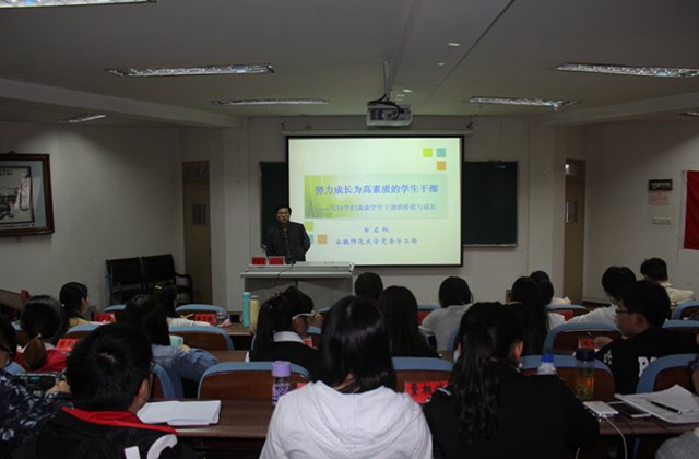 学生处处长台启权在团学培训班上做了《努力成长为高素质的学生干部》的主题报告,他从新形势下学生工作面临的大众化、学分化、信息化、社会化等挑战入手,重点阐述了高校学生干部及其作用、选拔和组建、培养和使用、队伍现状与问题四方面内容。他着重强调了学生干部角色定位,要求兼顾好“特殊的学生”和“特殊的干部”的双重身份,做好老师的助手、学生的表率、师生之间的桥梁和纽带。同时,他号召广大团学干部明确自身定位,兼顾好学习和工作的关系,争做一名优秀的学生干部。