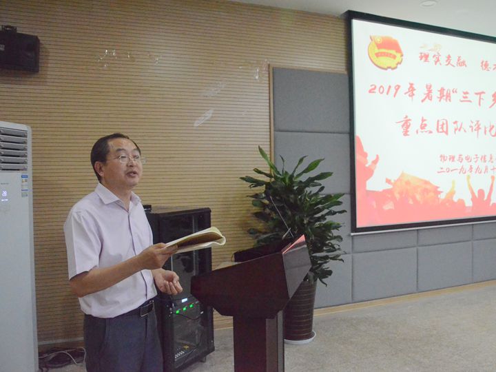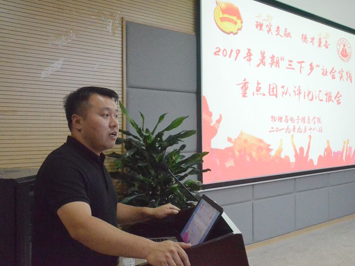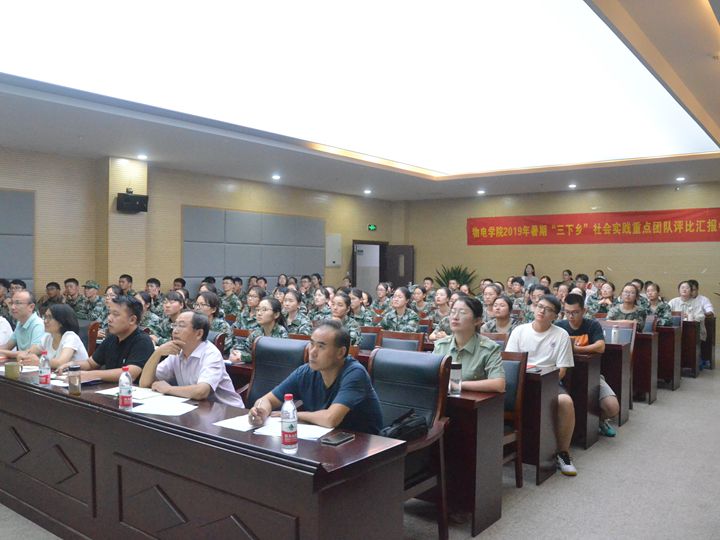 在举行2019年暑期“三下乡”社会实践团队评比交流会。学院党委副书记黄友生、物理学专业负责人张季谦、通信工程专业负责人张爱清、实训中心主任蔺玉柱和院团委副书记甘露担任评委,全体专兼职辅导员、实践团队骨干以及2019级新生代表参加了汇报会。汇报会由学院团委书记宋凤楼主持。