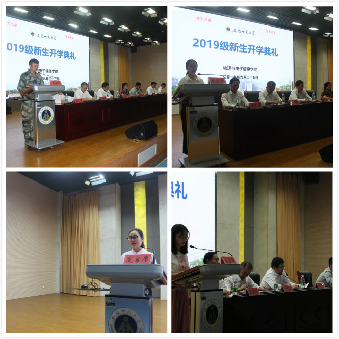 典礼在庄严的国歌声中拉开序幕。2019级物理学(师范)专业王祥泉同学作为本科新生代表发言,他承诺会在大学学习中明确自身定位、培养良好品质、提升综合素质,做一名有理想、有本领、有担当的大学生;研究生新生代表左崇睿表示,在践行“厚德重教、博学笃行”校训的同时,要做到明确自身目标与方向,在学习中增长知识、锤炼品格,在工作中增长才干、练就本领,以真才实学服务人民,以创新创造贡献国家;2016级电子信息工程专业本科生李紫薇与2017级生物物理专业研究生方婷婷作为老生代表分别上台,同学弟学妹们讲述了自己大学学习生活的经历与感悟,祝愿学弟学妹们学有所成,前程似锦。