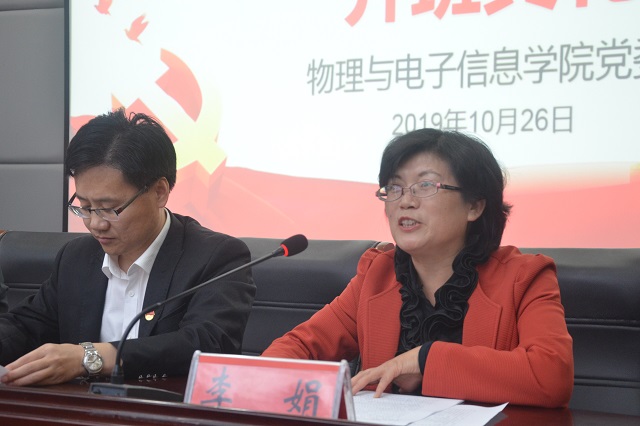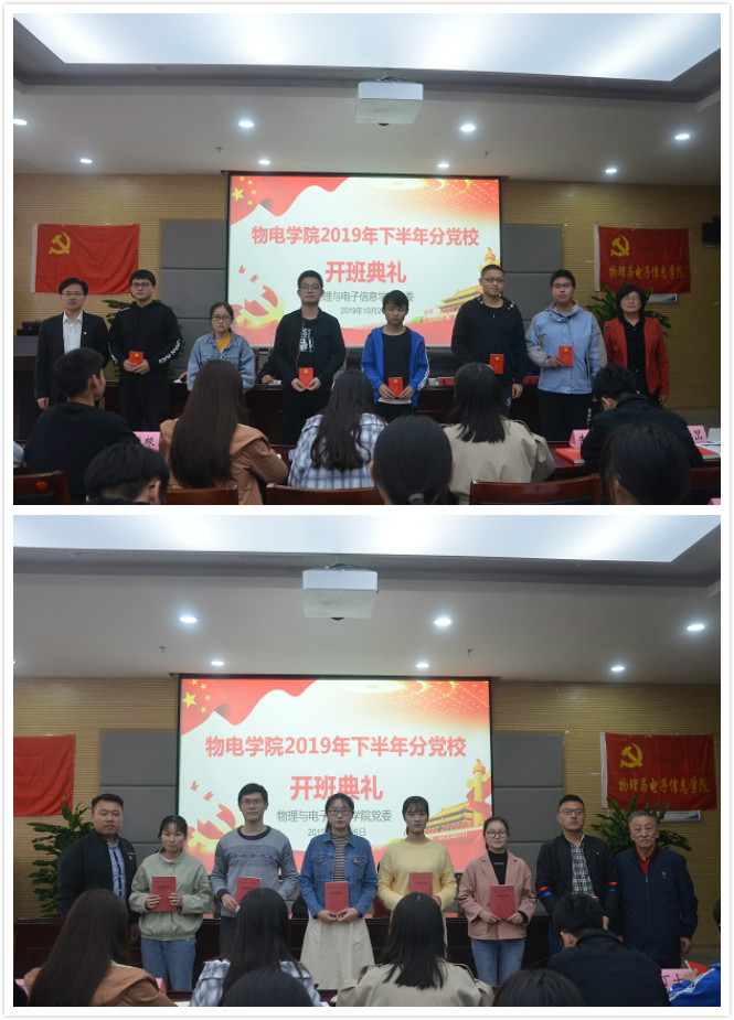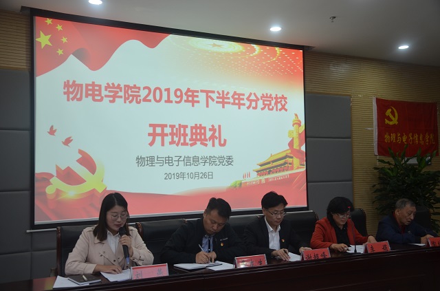 2019年下半年分党校培训班开班典礼在物理楼304会议室举行。校党委组织部副部长、校党校常务副校长谢超峰,院党委书记、分党校校长李娟,院党委副书记、分党校副校长黄友生,院关工委副主任、分党校指导老师陶绪德参加开班典礼。开班典礼由培训班班主任刘燕主持。