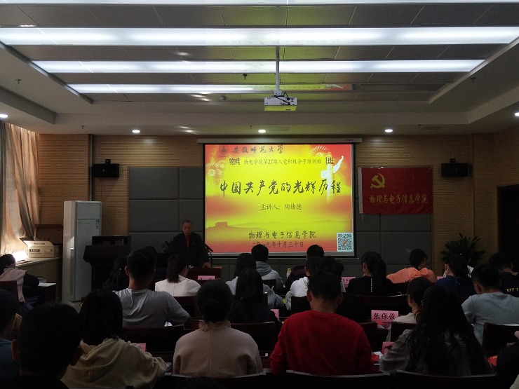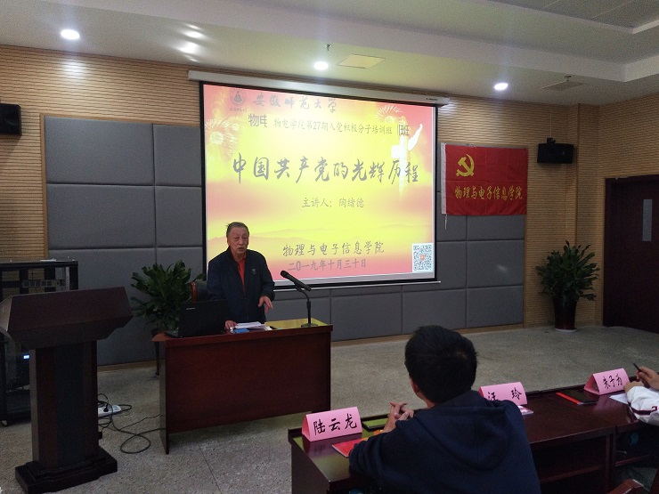 刘燕 孟柱)10月30日下午,学院分党校在物理楼335会议室组织进行了2019下半年入党积极分子培训班第二次授课,院关工委常务副主任陶绪德老师为入党积极分子培训班学员作中国共产党的光辉历程专题培训。