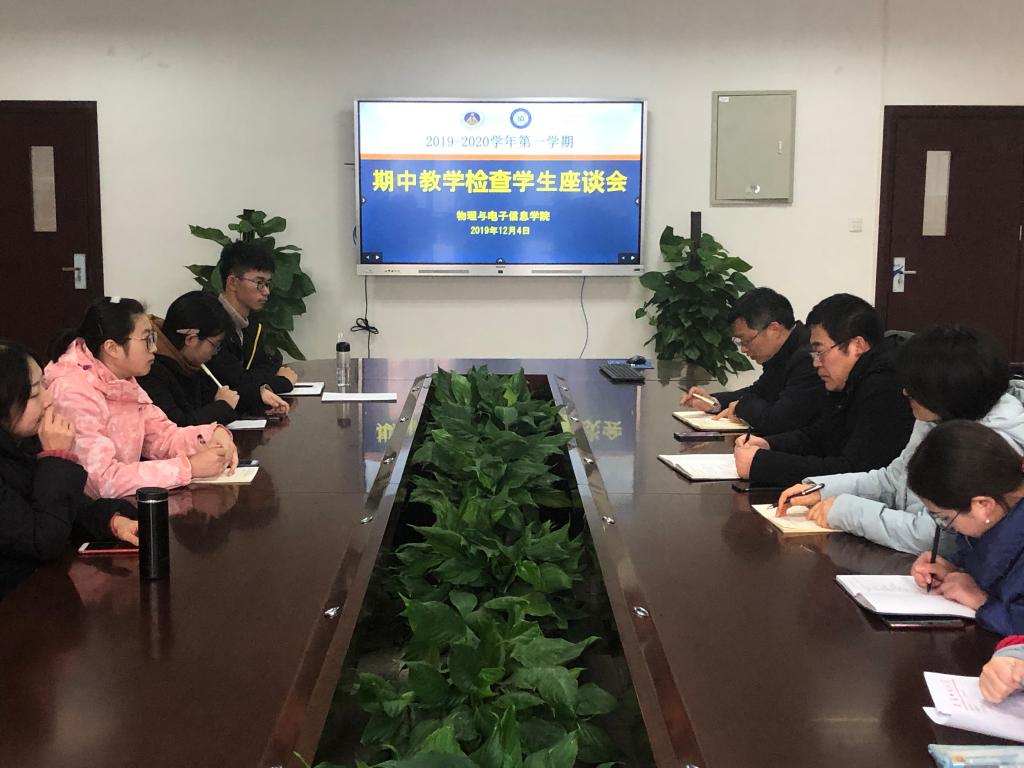 )为了解学生的学习动态情况,解决学生在学习方面存在的问题, 12月4日下午学院于物理楼308会议室召开期中教学座谈会,学院院长郑贤锋、教学副院长许新胜、各专业负责人和辅导员代表、各年级各专业学生代表参加了会议。座谈会由许新胜院长主持。