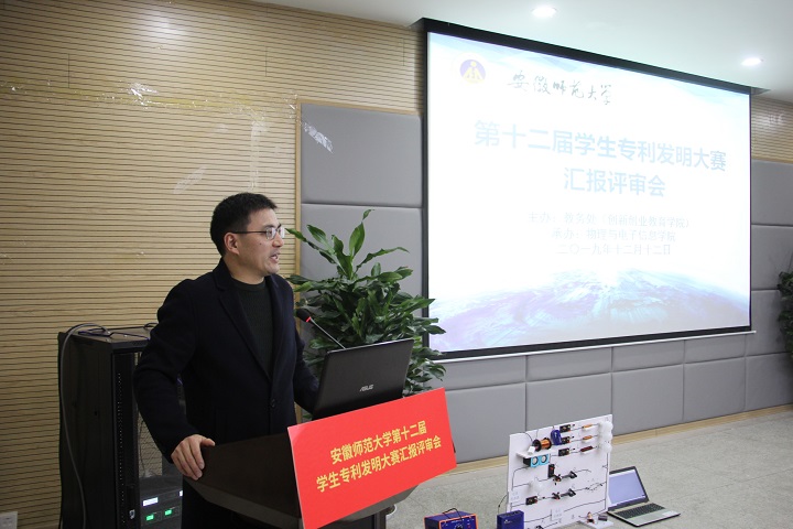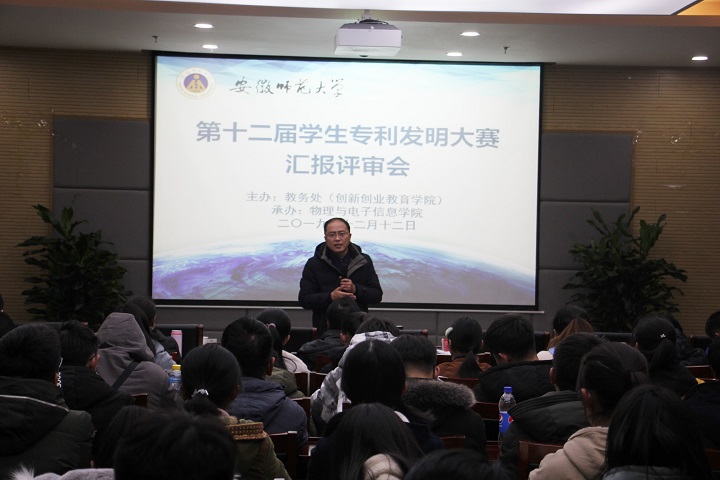 第十二届学生专利发明大赛决赛于物理楼304报告厅隆重举行,本次比赛由校教务处主办,物理与电子信息学院承办。教务处处长周端明、副处长李汪根、参赛学院教学副院长及分管领导出席汇报评审会,生命科学学院聂刘旺,环境科学与工程学院杨如意,化学与材料科学学院宇海银,美术学院朱德义,计算机与信息学院孙丽萍,信息管理中心副主任吴长义,包子漫画
