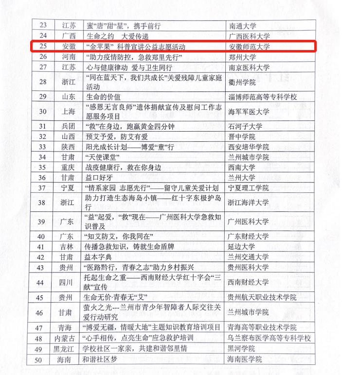 申报的《“金苹果”科普宣讲公益志愿服务行》项目成功获批立项,并获得专项资助。安徽省仅我校入选,这也是我校首次获批国家级红十字会社会实践项目。