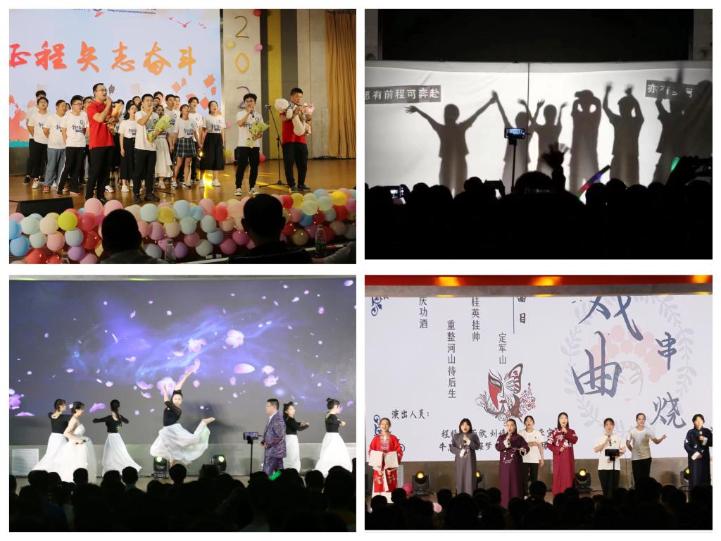 【新时代,矢志奋斗】青衿之志,履践致远。歌伴舞《起风了》动听的歌声与曼妙的舞姿交织,余音绕梁,倾述离别之情。舞台剧《光影物电》采用光影的手法,记录了从高考结束到考研毕业这一路的点点滴滴,既充满生活气息又令人万千感慨。戏曲串烧《大好河山》用婉转的戏腔和曲调,沉浸于戏曲的世界,感受戏曲的韵味。师生联唱《夜空中最亮的星》《凤凰花开的路口》饱含着包子漫画