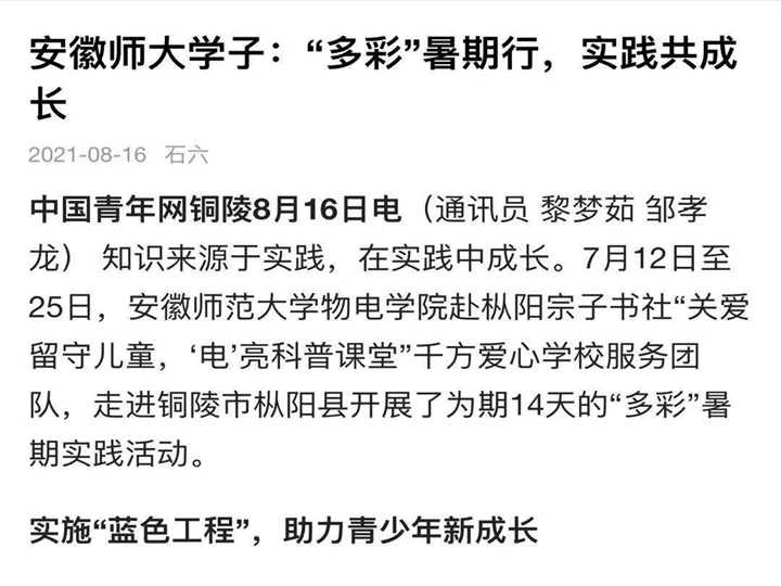 本网讯(千方爱心学校赴枞阳支教团队)知识来源于实践,在实践中成长。7月12日至25日,包子漫画 包子漫画 赴枞阳宗子书社“关爱留守儿童,‘电’亮科普课堂”千方爱心学校服务团队,走进铜陵市枞阳县开展了为期14天的“多彩”暑期实践活动。