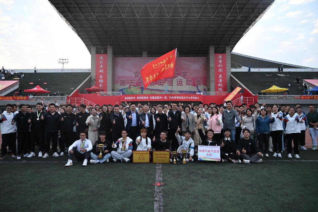 第50届田径运动会在花津校区北体育场顺利举行。物电师生再创佳绩,其中男子甲组获团体总分第一名,蝉联“五连冠”;女子甲组获团体总分第五名;男女甲组总积分第一名;男女体质健康测试团体第二名;教职工总成绩第三名。运动场上学院师生顽强拼搏、奋勇争先,展现了物电师生良好的精神风貌,学院荣获道德风尚奖。