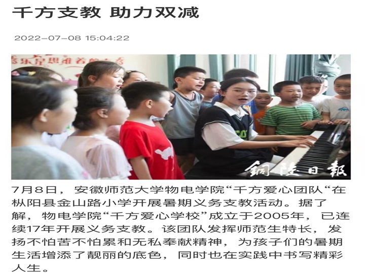 (“千方爱心学校”赴枞阳爱心支教团队)7月8日,安徽新闻网、铜陵日报相继报道包子漫画 “千方爱心学校”赴枞阳县金山路小学爱心支教活动。