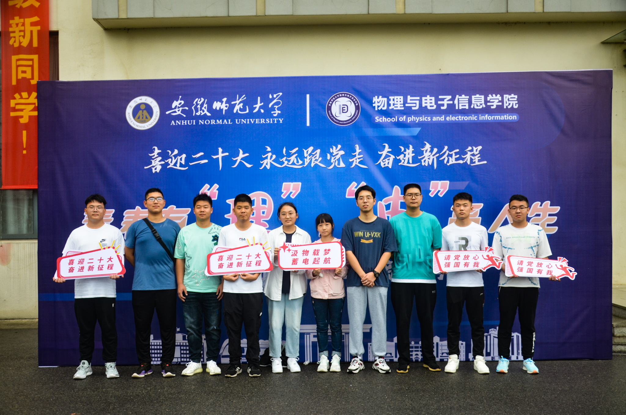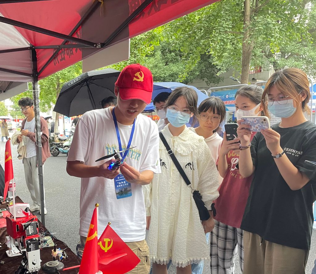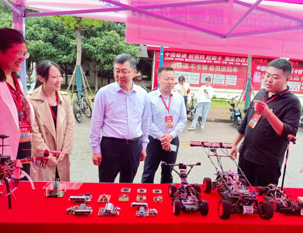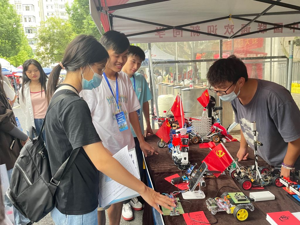 迎新现场,一列展台上展示着物电学子亲自制作的部分科技作品,从工科学生研发的舞蹈机器人、激光雕刻机、自平衡智能车、四轴飞行器、温度检测调节系统到物理师范生自制的电动机演示板、库伦定律演示仪、自制安培力演示仪等物理教具作品,通过学生志愿者专业演示与讲解,让新生们在专业“第一课”中感受学科魅力。此外,学院学团组织简介、育人品牌项目、2022届考研光荣榜等宣传内容也在潜移默化中让专业思想教育加深加固。