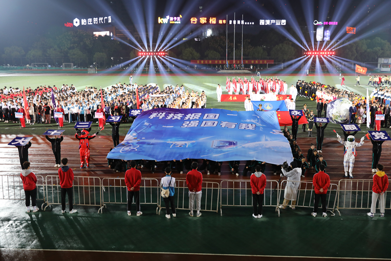 立足专业,展示风采。“十年辉煌,红心向党。青春赛场,物电最强”,10月27日晚,在校运会开幕式上,学院方阵队步伐有力,精神抖擞,口号嘹亮地入场。两名宇航员的Cosplay蕴含着物电学子的太空之梦,而以中国十年科技为主题,由量子纠缠、四旋翼无人机、电子芯片、天宫空间站等电子与物理科学技术元素组成的特色旗帜。是物电学子在中国式现代化道路上,用专业本领践行“学习二十大,永远跟党走”的铿锵誓言。在开幕式最后集体舞表演中,学院排舞队以整齐优美的舞姿演绎《一起向未来》,奏响青春乐章。