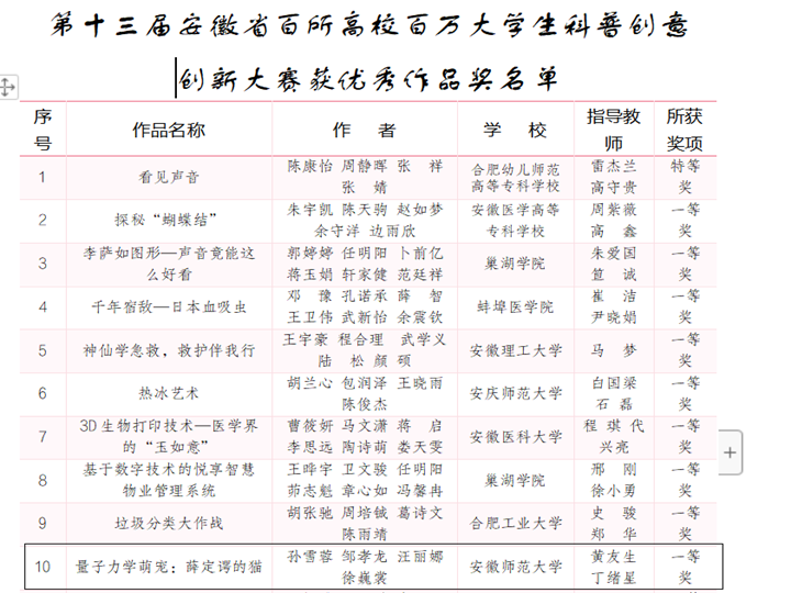 1月16日,由省科协、省教育厅、团省委主办的第十三届安徽省百所高校百万大学生科普创意创新大赛获奖名单公布。由黄友生、丁绪星指导,孙雪蓉、邹孝龙、汪丽娜、徐巍裳等同学的团队作品《量子力学萌宠:薛定谔的猫》荣获一等奖,包子漫画