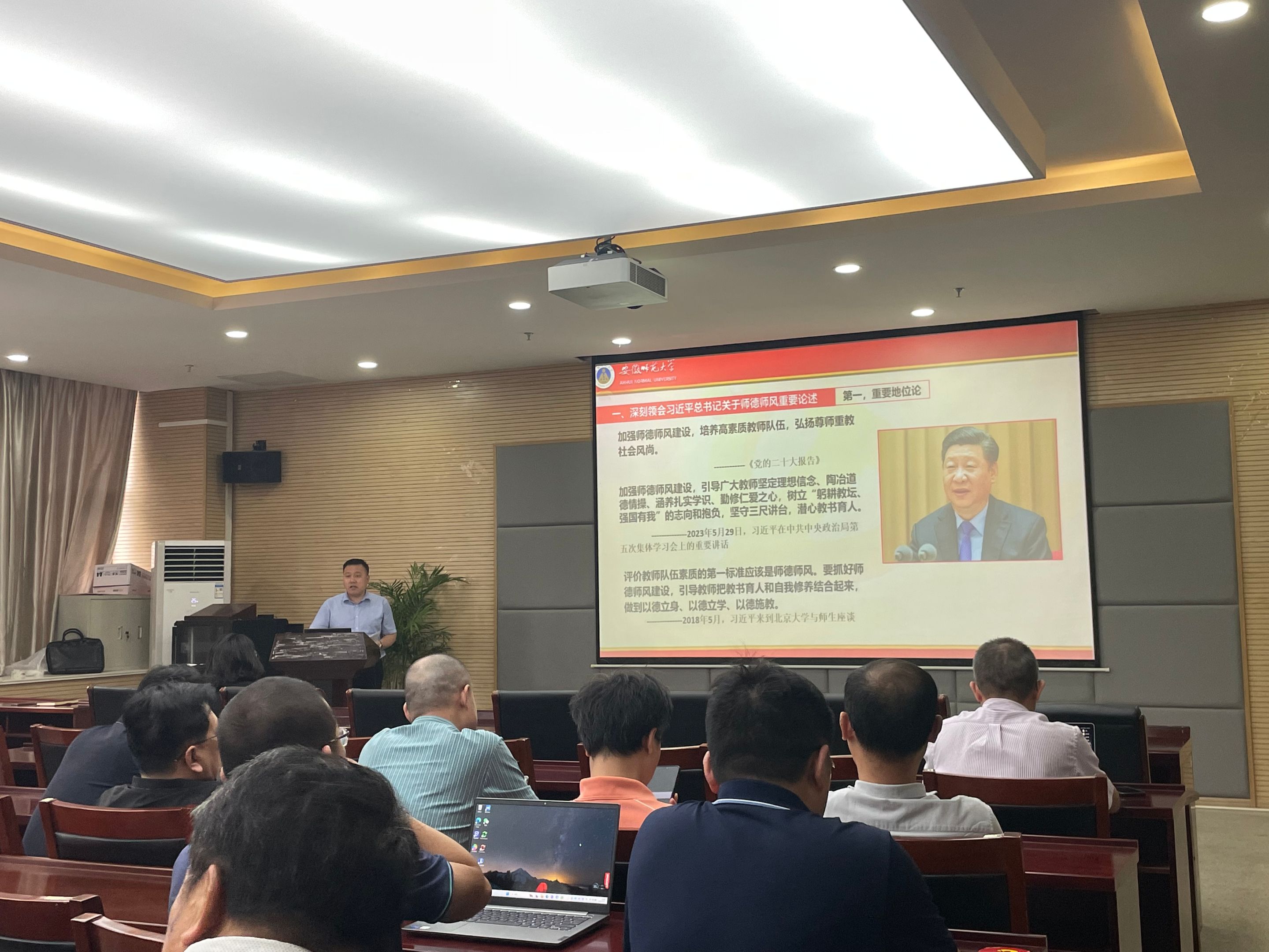 在物理楼304会议室召开5月份全体教职工大会,开展师德师风问题专项排查治理工作动员部署及专题教育工作,布置校园安全稳定等近期重点工作。学院全体教职工参加了会议。会议由院党委书记李娟主持。