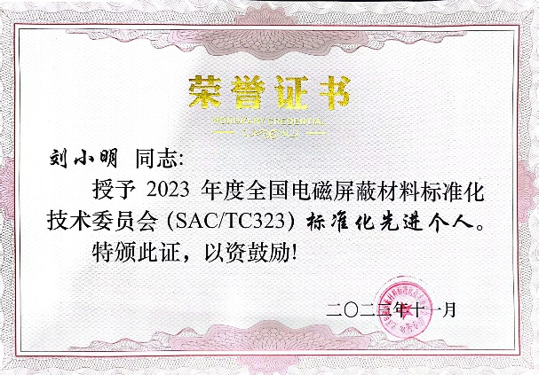 刘小明教授在担任全国电磁屏蔽材料标准化技术委员会第三届委员期间,参加国家标准制定2项,参加标准复审10多项。