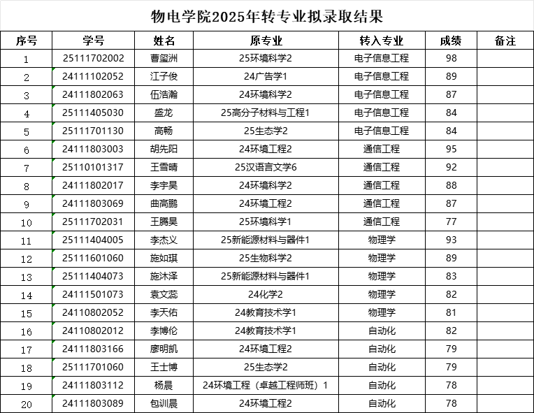 转专业拟录取名单公示如下,公示期为2025年12月26日至12月30日,如有异议,请在公示期内向工作组反映,提倡实名反映问题。