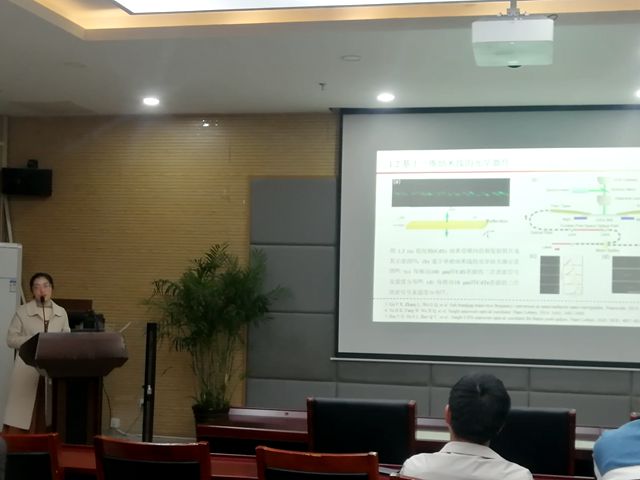 廖风老师此次报告的内容是《低维半导体材料复合微纳光纤有源光子器件研究》。她从背景、基于单根GaSe纳米带的光学自相关性和MoS2荧光增强性质研究三个部分介绍了近期的科研工作和成果。廖老师利用CVD方法成功合成了厚度长度可达几百微米的GaSe纳米带,并利用导波激发的方法,获得高效的二次谐波信号。并在此基础上,构建了以单根GaSe纳米带为核心的自相关仪,以此来研究超短脉冲的脉宽,色散等信息。汇报后,同学们就汇报内容展开了热烈的讨论和交流。