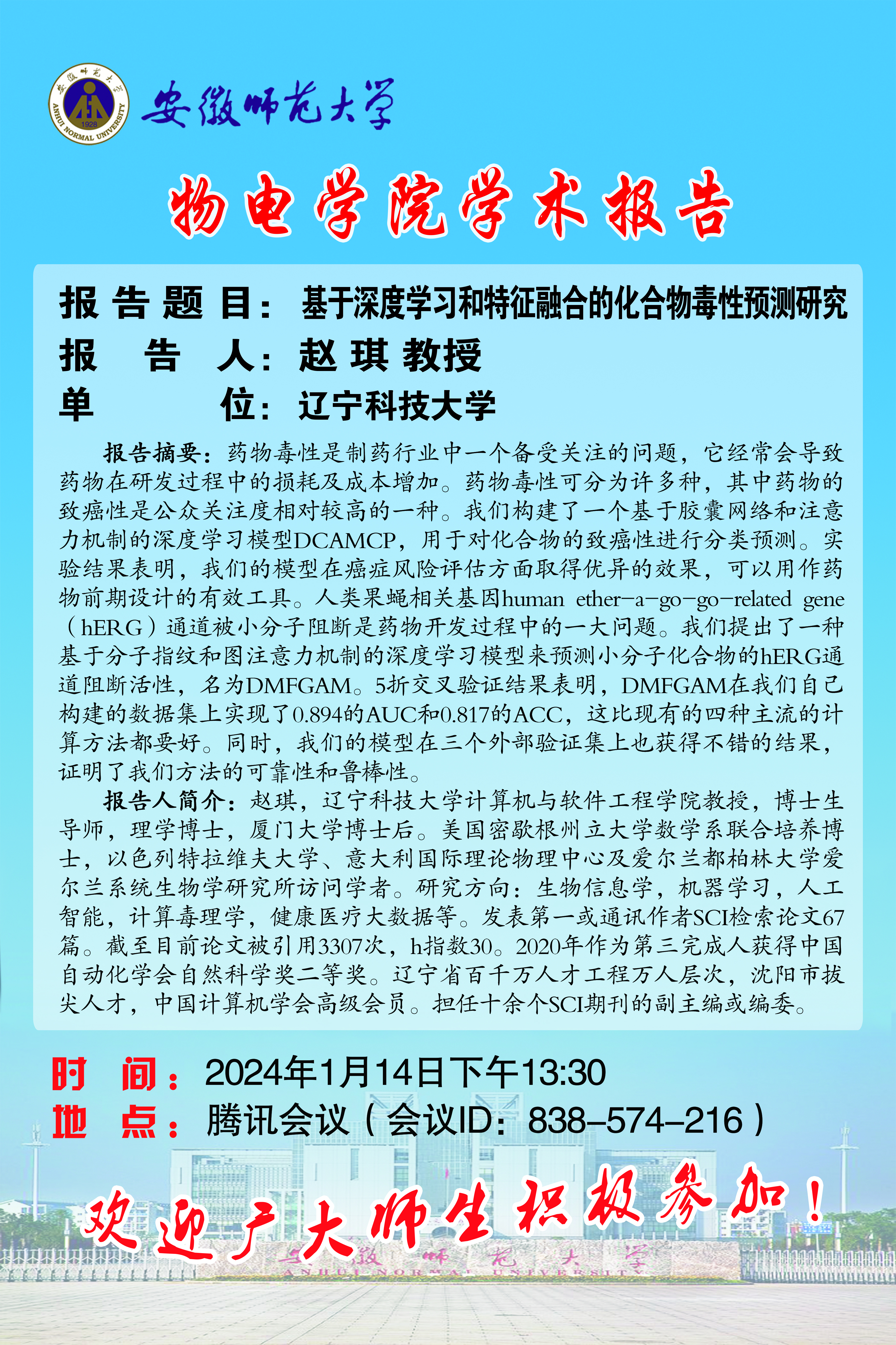 【学术预告】物电讲坛第3期:基于深度学习和特征融合的化合物毒性预测研究