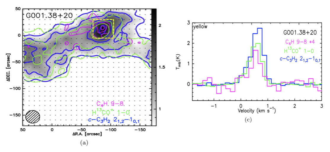 图1 C4H 9-8和c-C3H2 2-1在G001.38+20冷云核中的空间分布和谱线