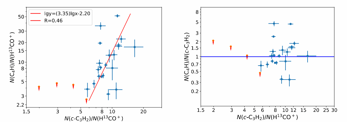 汤宁宇特任教授领导的星际介质演化课题组与广西大学王均智教授紧密合作,对一批普朗克冷云核中的C4H和c-C3H2进行了成像观测,研究了不同分子之间的空间分布和相对丰度的关系。通过分子的相对丰度和成像信息,结合化学模型,发现这两种分子丰度之间的相关性较低。一种解释是,这两种分子的化学反应网络不存在紧密的联系。这项研究成果已经发表在天文国际期刊《Astrophysical Journal》上。