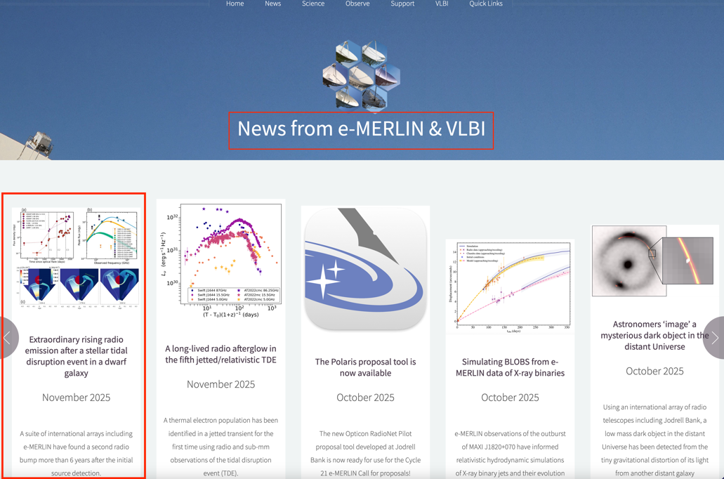 为第一完成单位。英国Jodrell Bank 天文台e-MERLIN网站以“Extraordinary rising radio emission after a stellar tidal disruption event in a dwarf galaxy ”为题,将该成果作为最新亮点进行了专题报道。