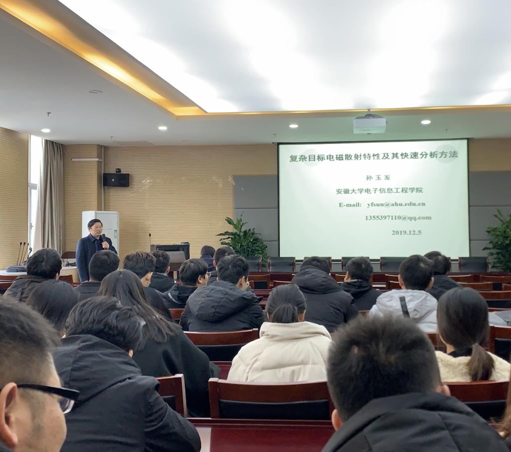 在本次报告中,孙玉发教授首先为大家介绍了电磁场与微波技术研究室的相关情况。随后,为大家讲述了电磁散射与雷达散射截面减缩的研究意义,并为大家详细介绍了电磁散射问题的分析方法。最后,孙教授为大家讲述了复杂目标电磁散射特性的快速分析方法,即:稀疏矩阵规则网络法(SMCG)、特征基函数法(CBFM)、渐近波形估计技术(AWE)及压缩感知(CS)。讲座结束后,与会的各位老师和同学就自己关心的问题与孙玉发教授展开深入交流与讨论。