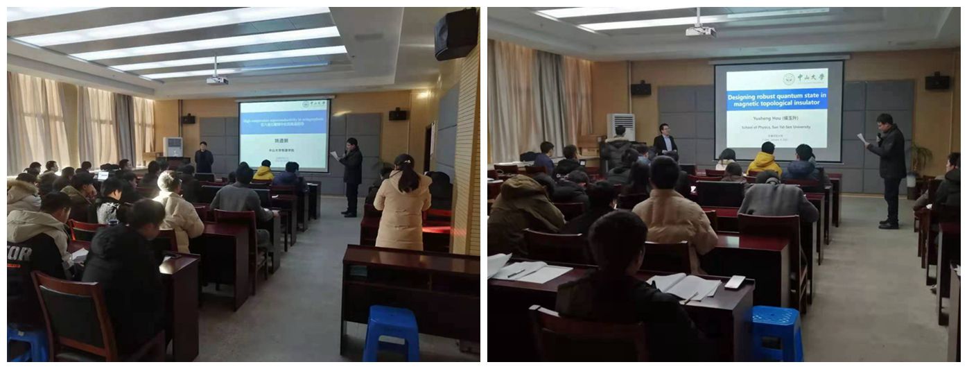 在本次报告会上,首先姚道新老师介绍了二维八角正方晶体结构在半填充情况下具有空穴口袋和电子口袋的完美嵌套,并提出在八角石墨烯的单层,多层和块材结构中都能实现高温超导电性。随后侯玉升老师介绍了什么是磁性拓扑绝缘体,以及它能够实现各种奇异的量子态的功能,详细介绍了通过合理组装新兴二维范德瓦尔斯磁性体系和三维拓扑绝缘体异质结来设计较高温度的量子反常霍尔效应和简单易行的轴子绝缘体相的理论方案。报告会结束后,与会的各位老师和同学就自己关心的问题与姚道新老师和侯玉升老师展开了热烈讨论和详细交流。