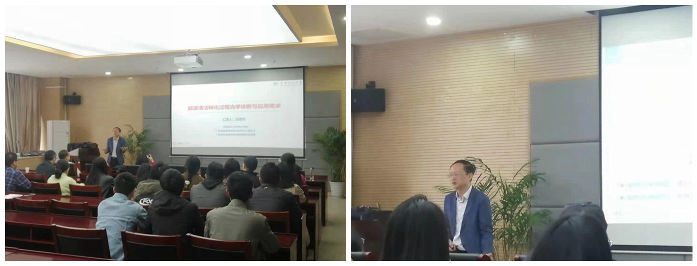在本次报告会上,陆继东教授首先讲解了我国目前的能源转型的总体思路,并指出能源开发、转换、存储、使用等各关键环节的飞速发展对先进光学测量技术提出了新的要求。之后以激光诱导击穿谱技术在能源工业激光诊断中的应用为例,详细介绍了其带领的团队近年来固体燃料转化机制、煤炭热转化设备入炉煤质、飞灰含碳量等特征参数的在线/快速分析方面的光学检测应用基础研究、技术开发和应用实践进展。报告会上,与会的各位老师和同学就自己关心的问题与陆继东教授展开了热烈讨论。