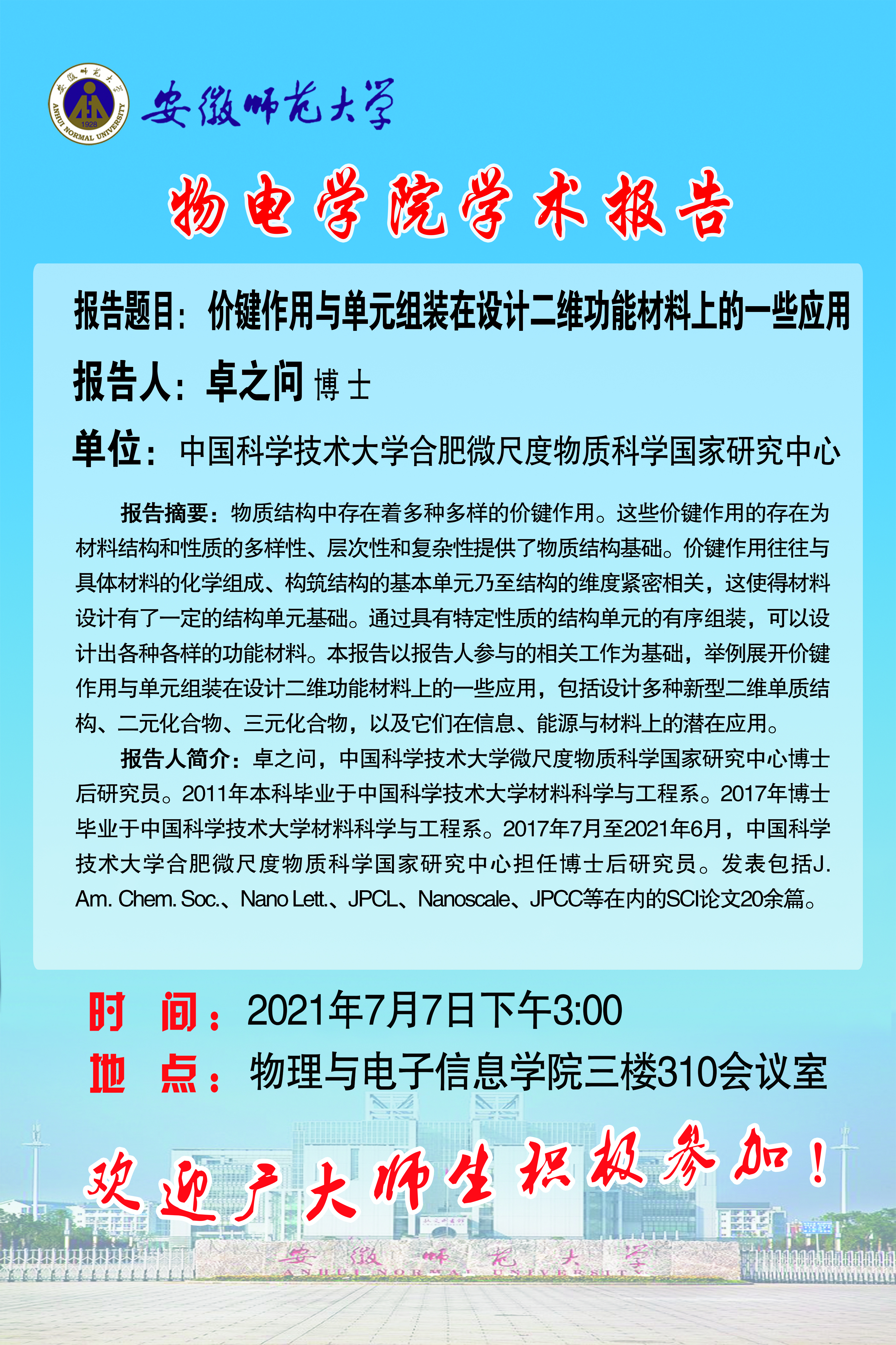 地址:花津校区-安徽省芜湖市九华南路189号 邮编:241000 电话:0553--3869894