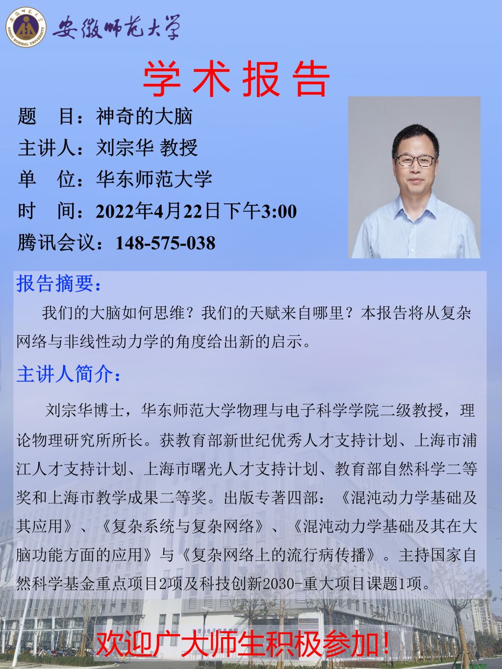 地址:花津校区-安徽省芜湖市九华南路189号 邮编:241000 电话:0553--3869894