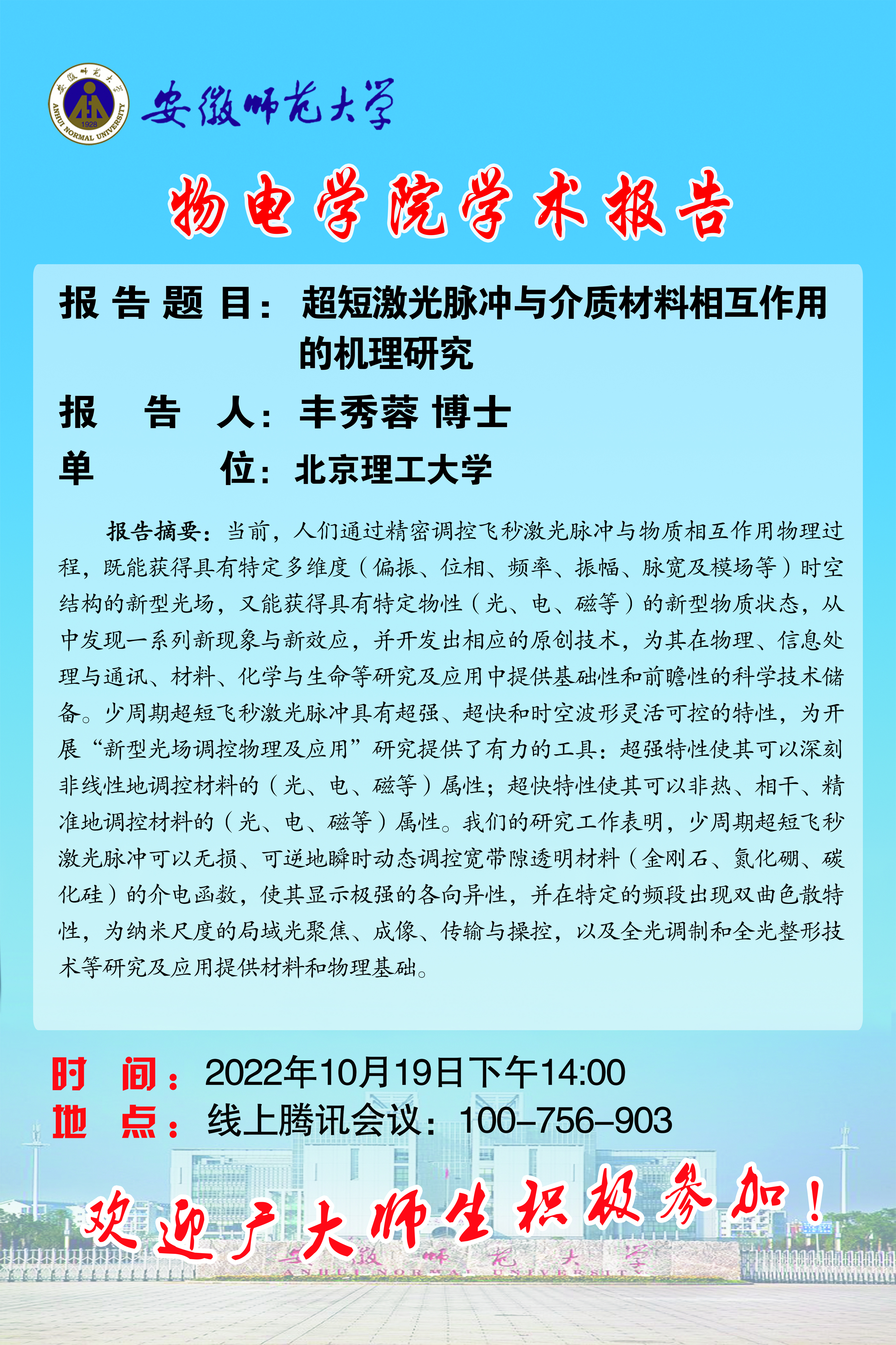 【学术预告·物电讲坛】丰秀蓉:超短激光脉冲与介质材料相互作用的机理研究